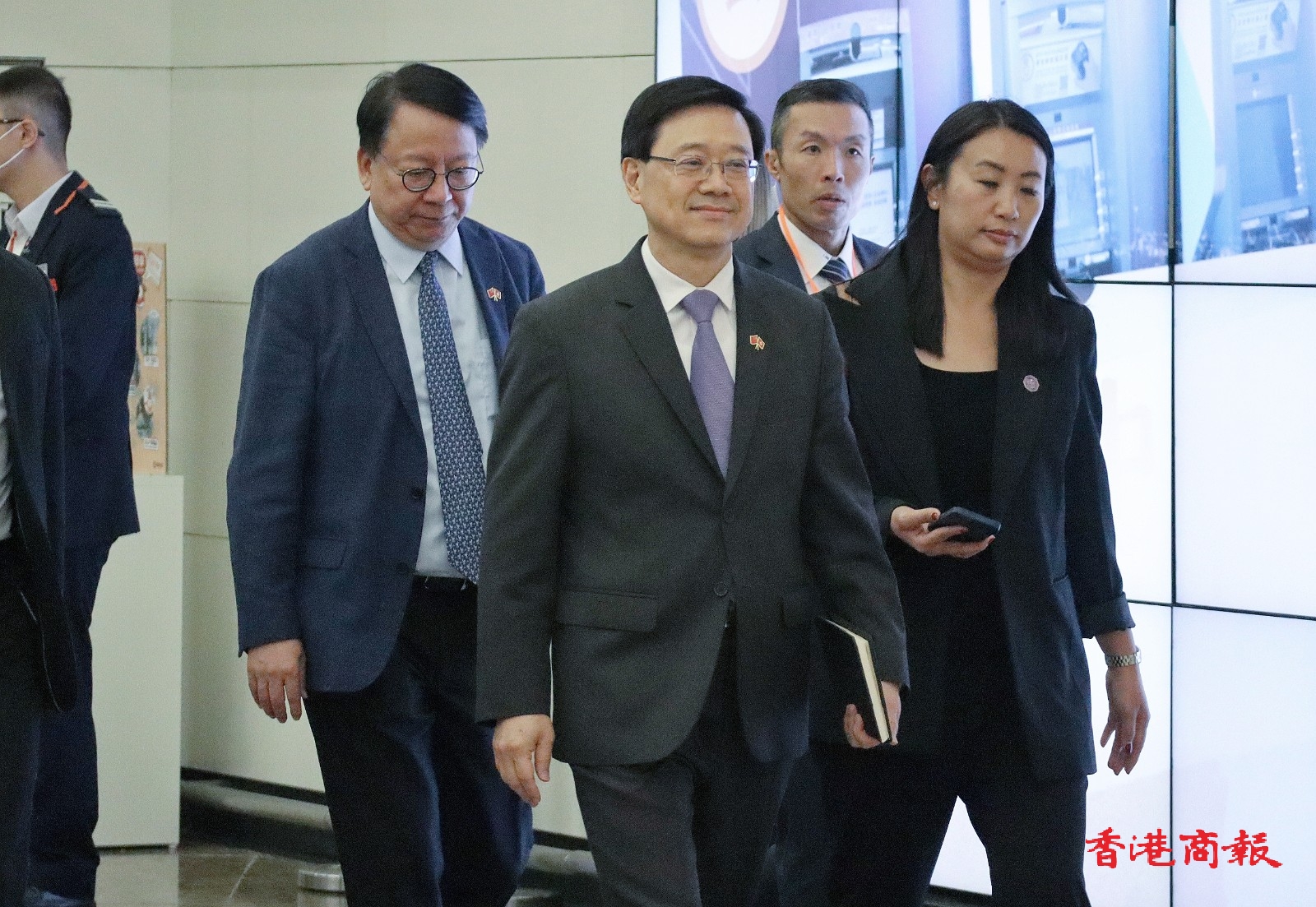 頂圖:行政長官李家超乘高鐵返港後總結今次4天考察行程,旁為政務司司長陳國基及立法會主席梁君彥。記者 馮瀚文攝