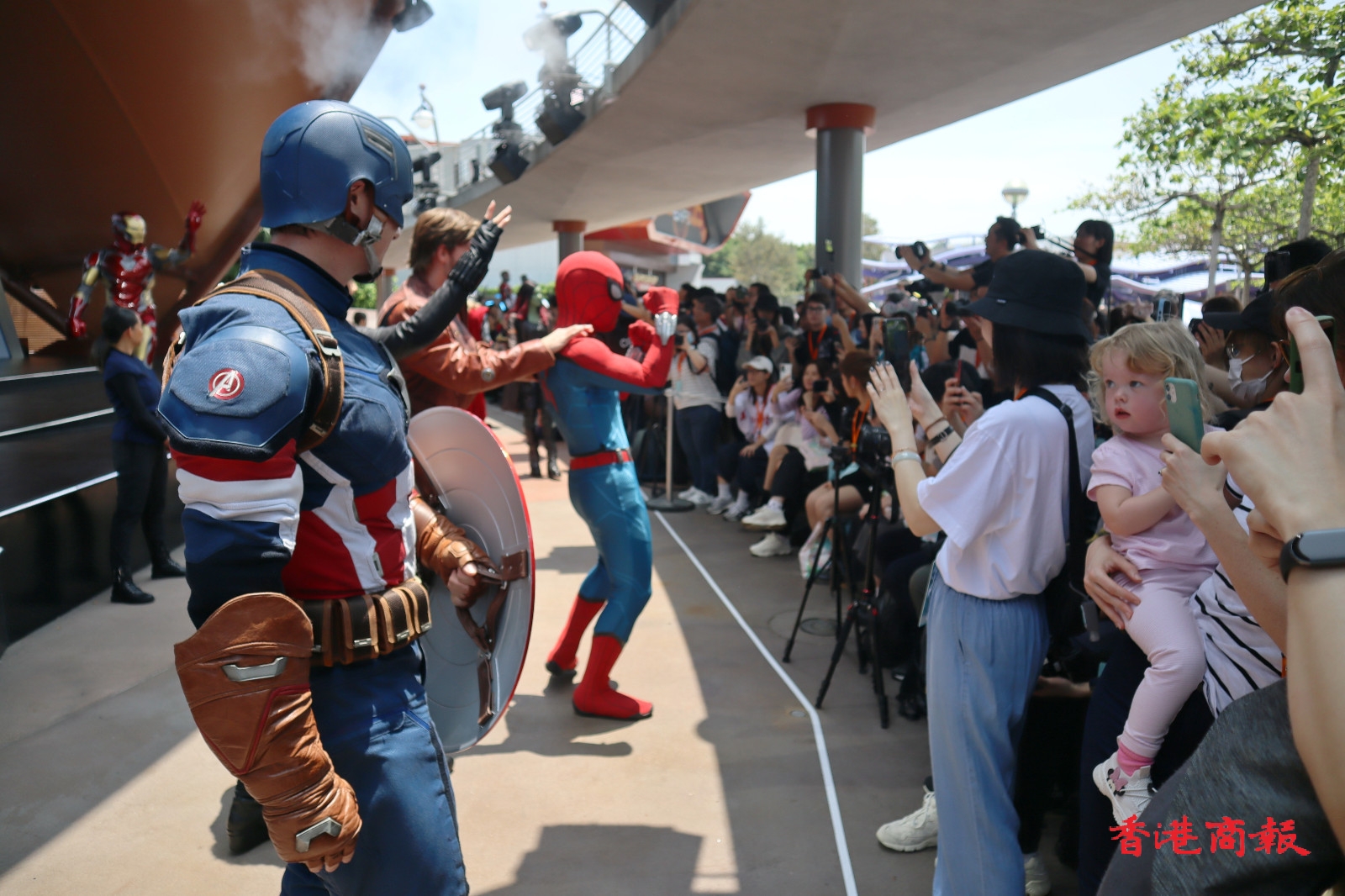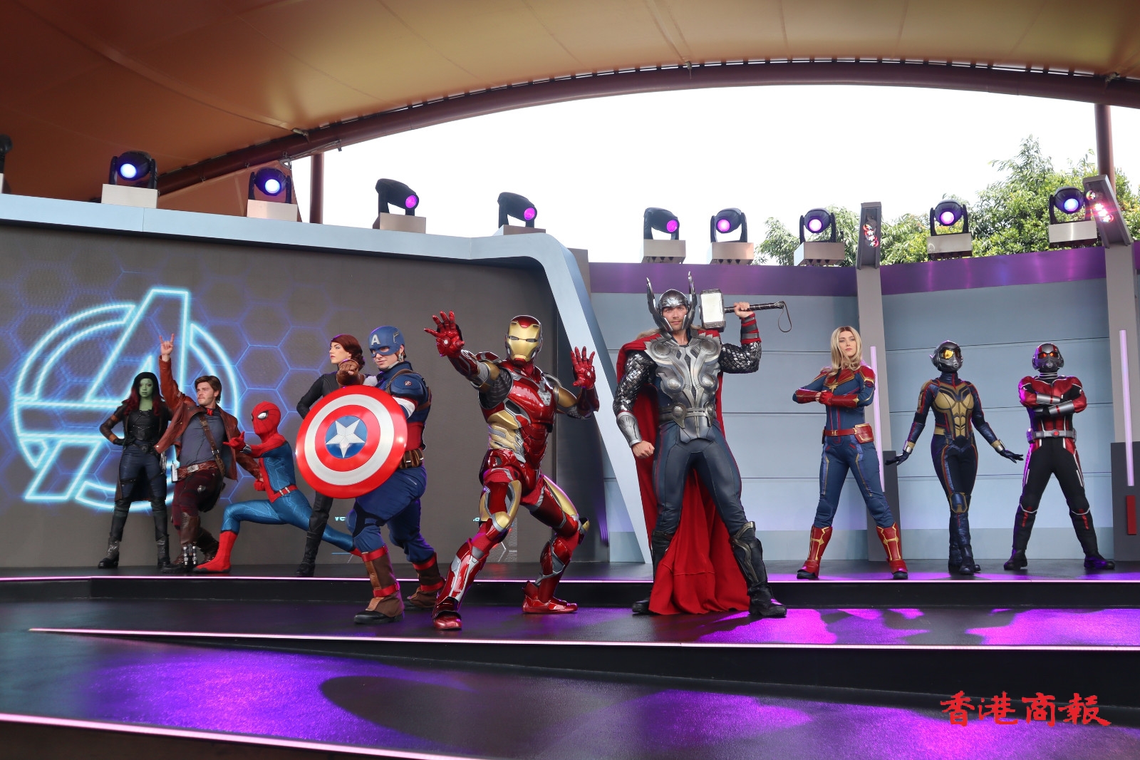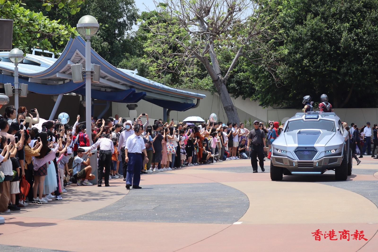 巡遊隊伍在「復仇者聯盟號」戰車的領航下,多位漫威超級英雄列陣登場,包括美國隊長、黑寡婦、雷神、蜘蛛俠、蟻俠、黃蜂女、驚奇隊長、星爵、嘉魔娜、 樹人等。此外,遊客可於科技展會合處領取英雄臂章,就可以未來英雄的身份與復仇者聯盟在巡遊中並肩前行,穿上最能突出自己英雄潛能造型的漫威迷,更有機會被現場鏡頭捕捉並投射至明日世界舞台的巨型LED屏幕。( 圖:馮瀚文攝 視頻:吳天恆)
