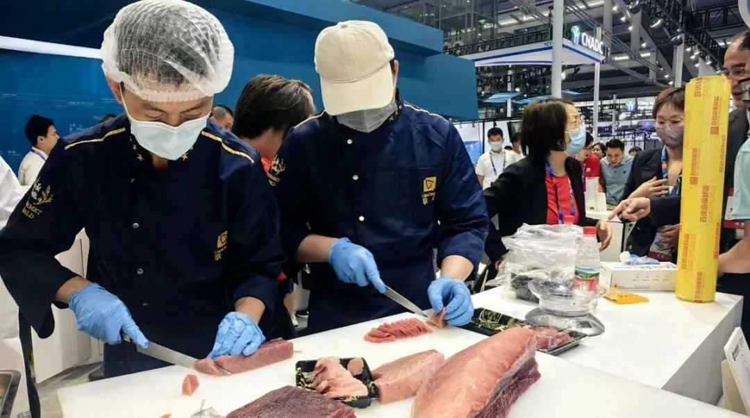 漁博會上,藍鰭金槍魚切魚秀吸引眾多遊客關注。深圳特區報記者 賴犁 何龍 李忠 攝