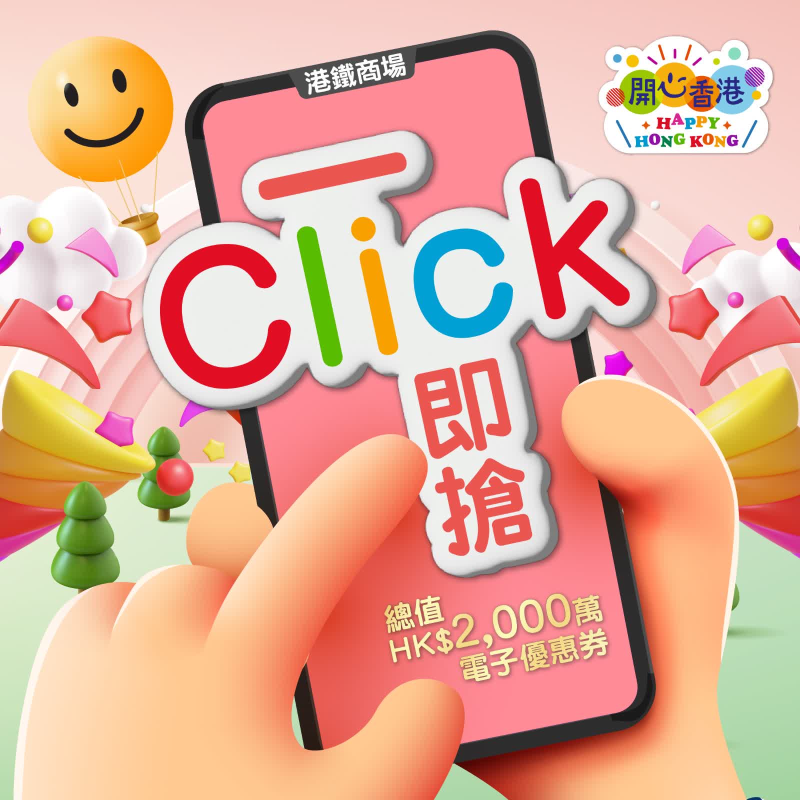為刺激本地消費,政府早前啟動「開心香港」一系列活動;而為支持「開心香港」活動,港鐵已於本月10日推出大型獎賞活動「一Click即搶」,連續3個星期三派發共12萬張港鐵商場電子優惠券,總值2000萬元,每人都有機會獲取最高1300元電子優惠券,先到先得。