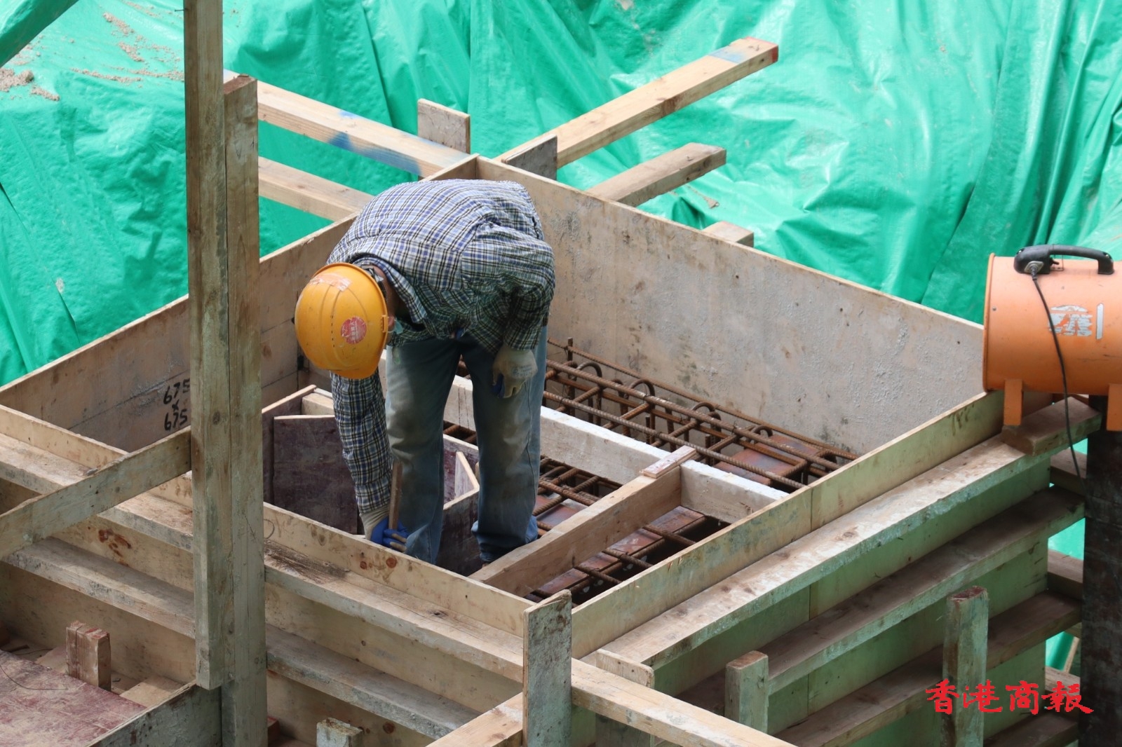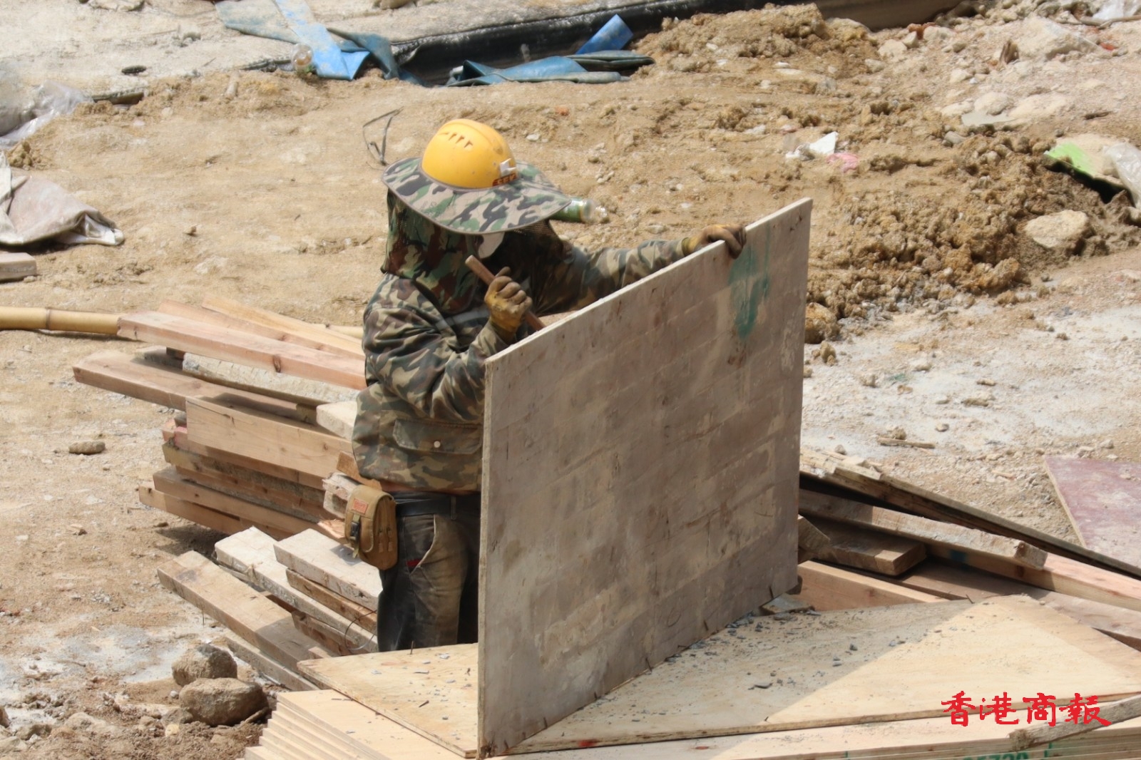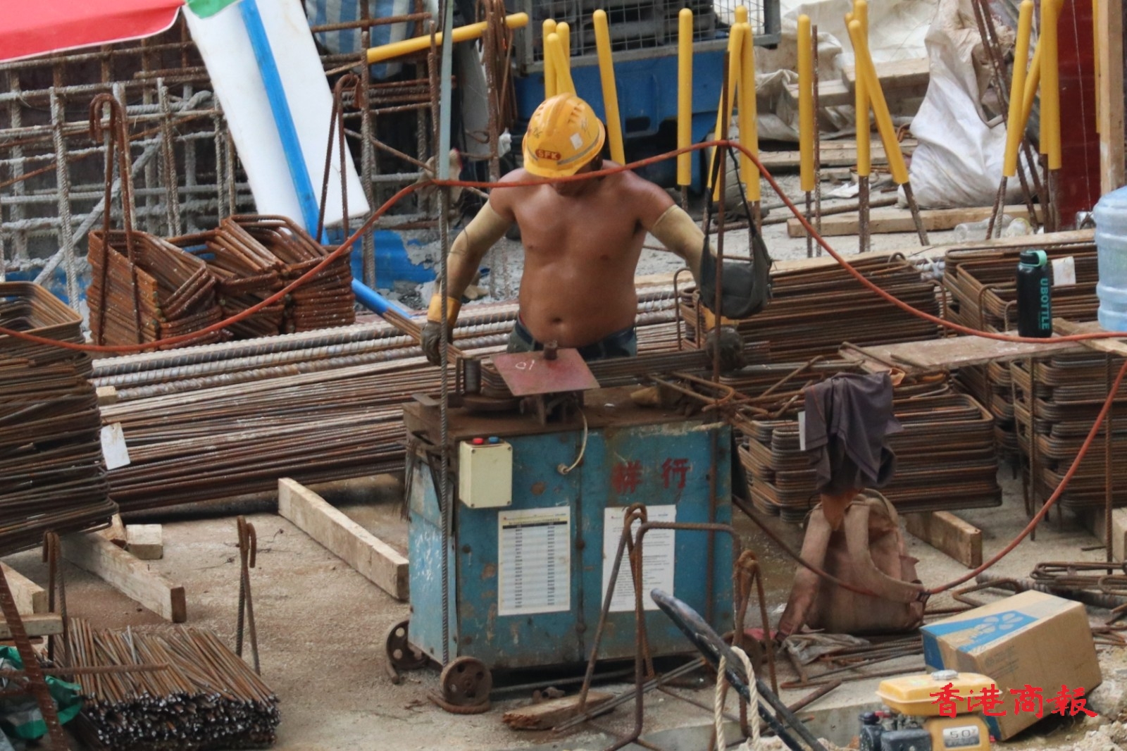自勞工處於5月15日推出《預防工作時中暑指引》和工作暑熱警告後,今天(19日)於上午10時40分再次發出黃色工作暑熱警告,表示部分工作環境的熱壓力頗高。勞工處提醒僱主及僱員在警告生效期間,採取適當措施,以預防在酷熱天氣下或高溫環境中工作而引致中暑。然而在地盤不少工人在炎熱天氣下仍然繼續工作。(馮瀚文 攝)