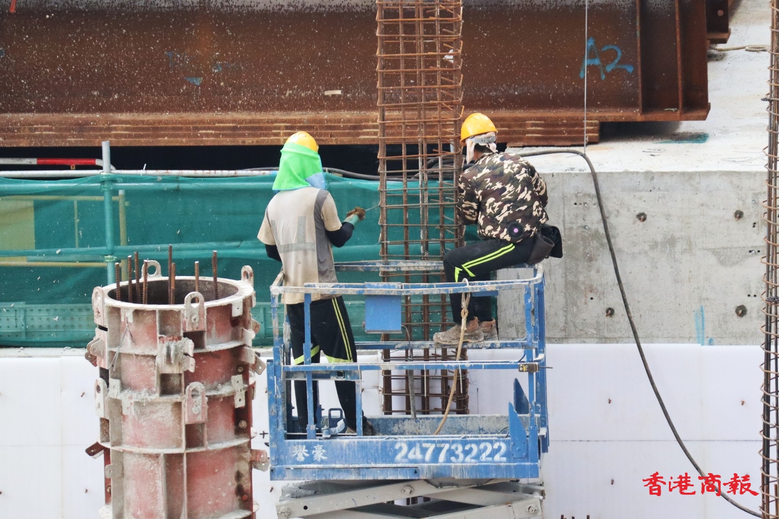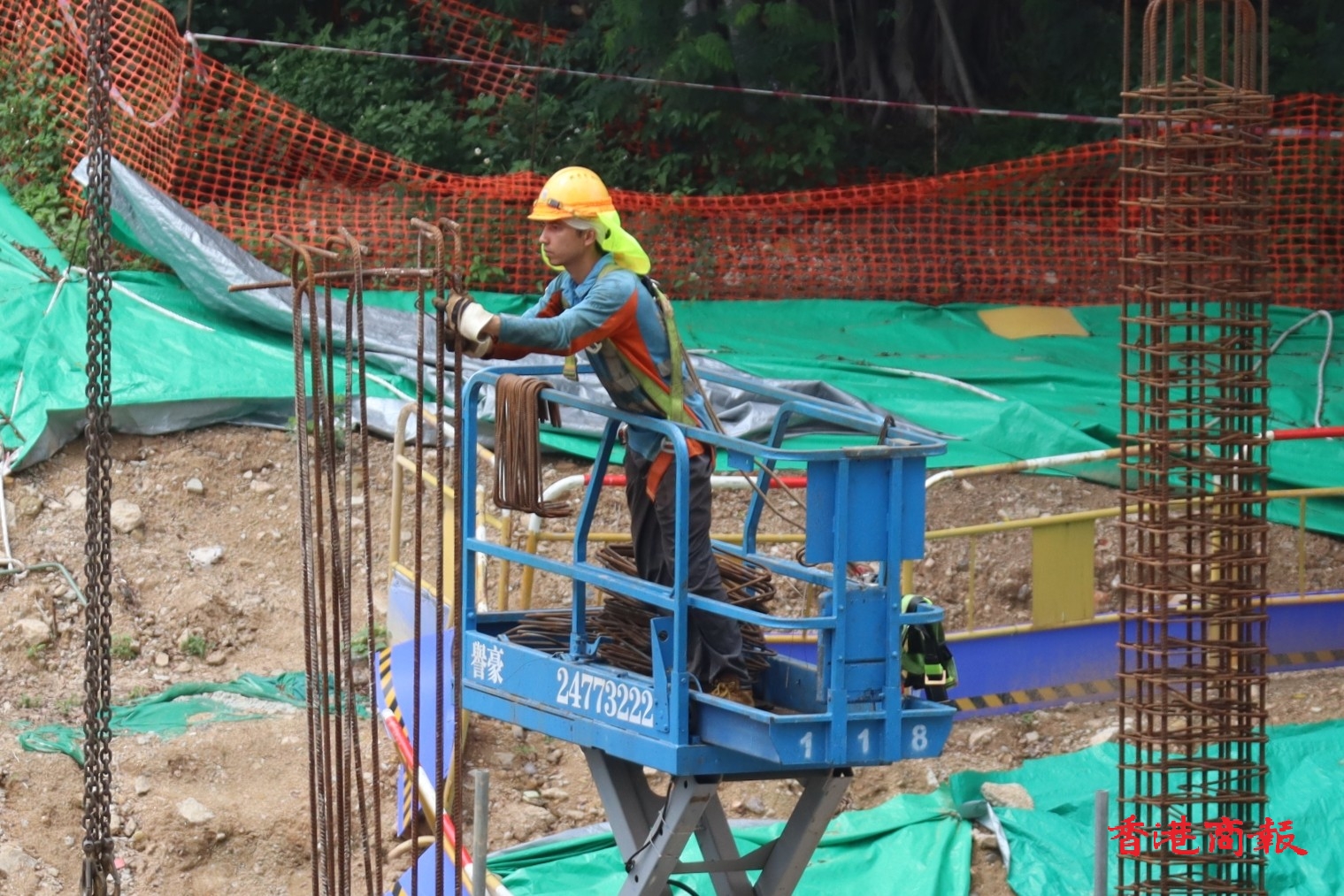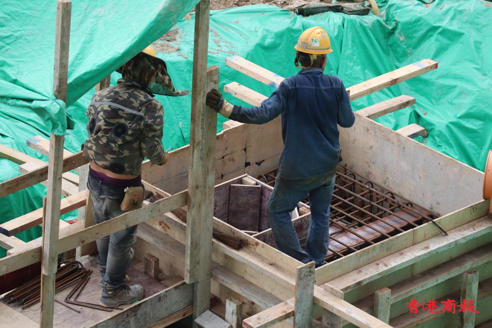 自勞工處於5月15日推出《預防工作時中暑指引》和工作暑熱警告後,今天(19日)於上午10時40分再次發出黃色工作暑熱警告,表示部分工作環境的熱壓力頗高。勞工處提醒僱主及僱員在警告生效期間,採取適當措施,以預防在酷熱天氣下或高溫環境中工作而引致中暑。然而在地盤不少工人在炎熱天氣下仍然繼續工作。(馮瀚文 攝)