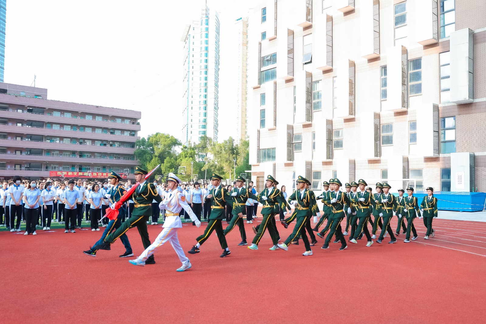 「傳遞國旗」環節將氣氛推向了高潮,當四名小護旗手擎「天安門國旗」從師生方陣頭頂略過時,師生們紛紛伸起雙手、輕撫國旗,盡情感受國旗帶來的國家力量和愛國情懷,對每個人更是愛國主義精神的洗禮和升華。