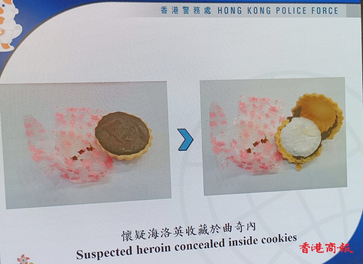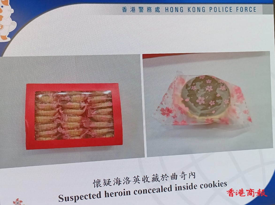 警方毒品調查科高級督察吳嘉倫指出,根據線報在昨日突擊搜查流浮山一幢3層高的村屋,搜出12包、重8公斤的海洛英粉末,6塊重2公斤的海洛英磚,25盒曲奇餅,經檢查後每塊曲奇餅均藏有海洛英粉末,共重4公斤,並在屋內拘捕一名涉嫌「販毒」的姓蘇無業男子(35歲)。