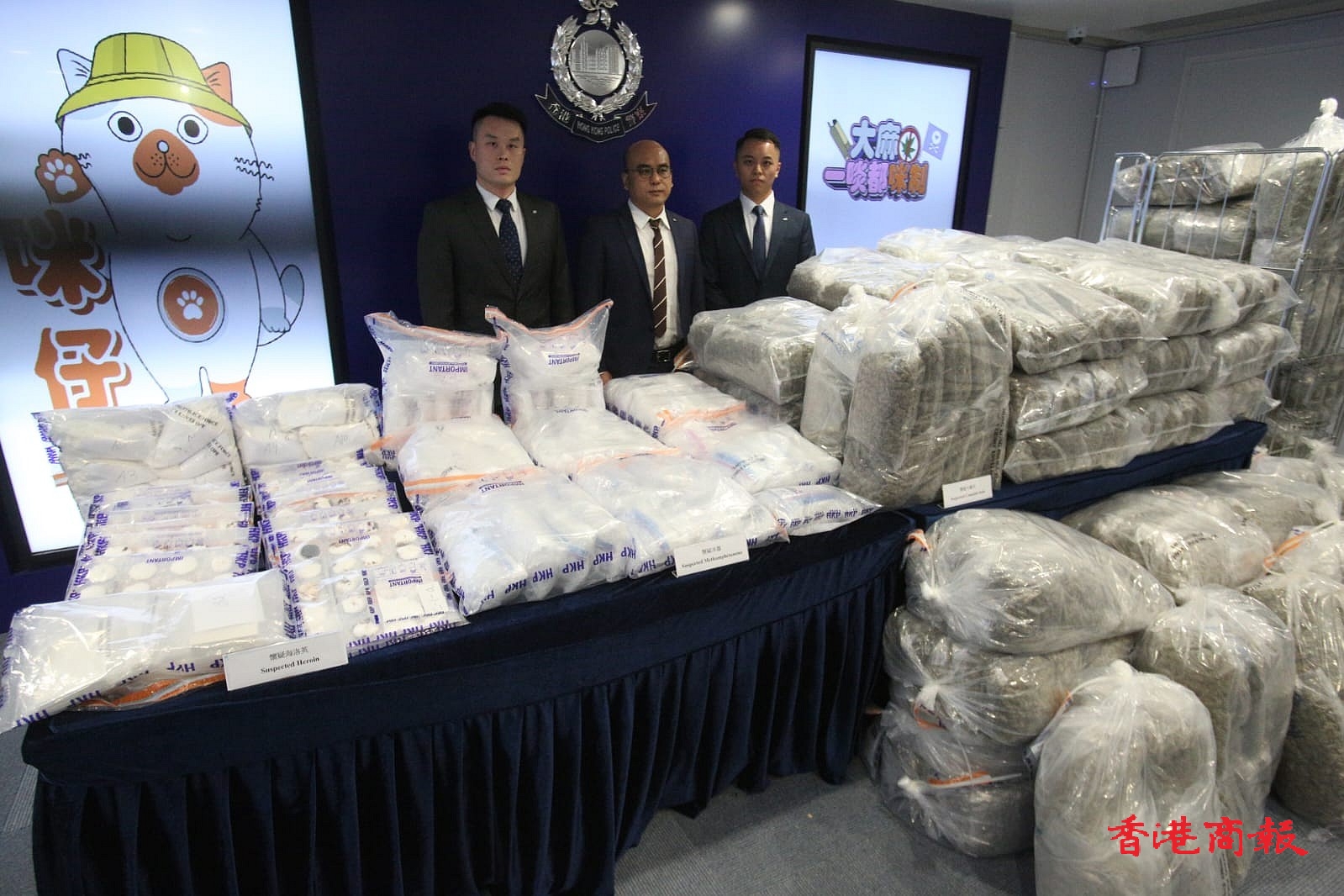 警方在24小時內搗破3宗販毒案。警方毒品調查科總督察湛耀光今日(2日)表示,在昨日(1日)分別在流浮山、元朗和鴨脷洲展開反毒品行動,拘捕3名男女,搗破兩個毒品儲存倉,檢獲309公斤大麻花、59公斤冰毒及14公斤海洛英,市值1.15億元;當中的大麻花是本年單一檢獲數量最多的案件。