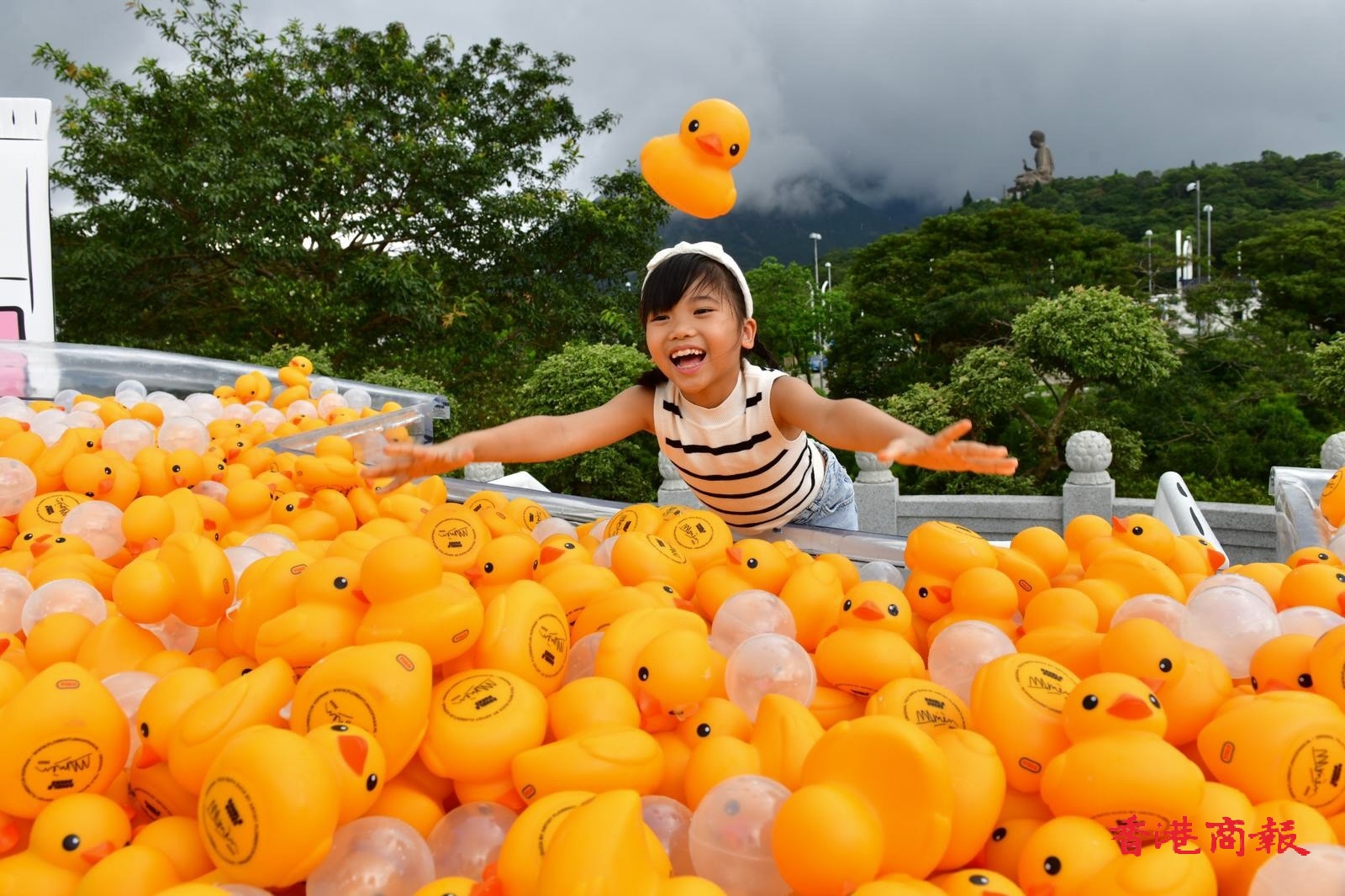 昂坪360董事總經理劉偉明及鄰舍輔導會總幹事馮綉文,共同將兩隻橡皮鴨放入已載有數千隻橡皮鴨的巨型透明浴缸內,正式啟動今次活動。