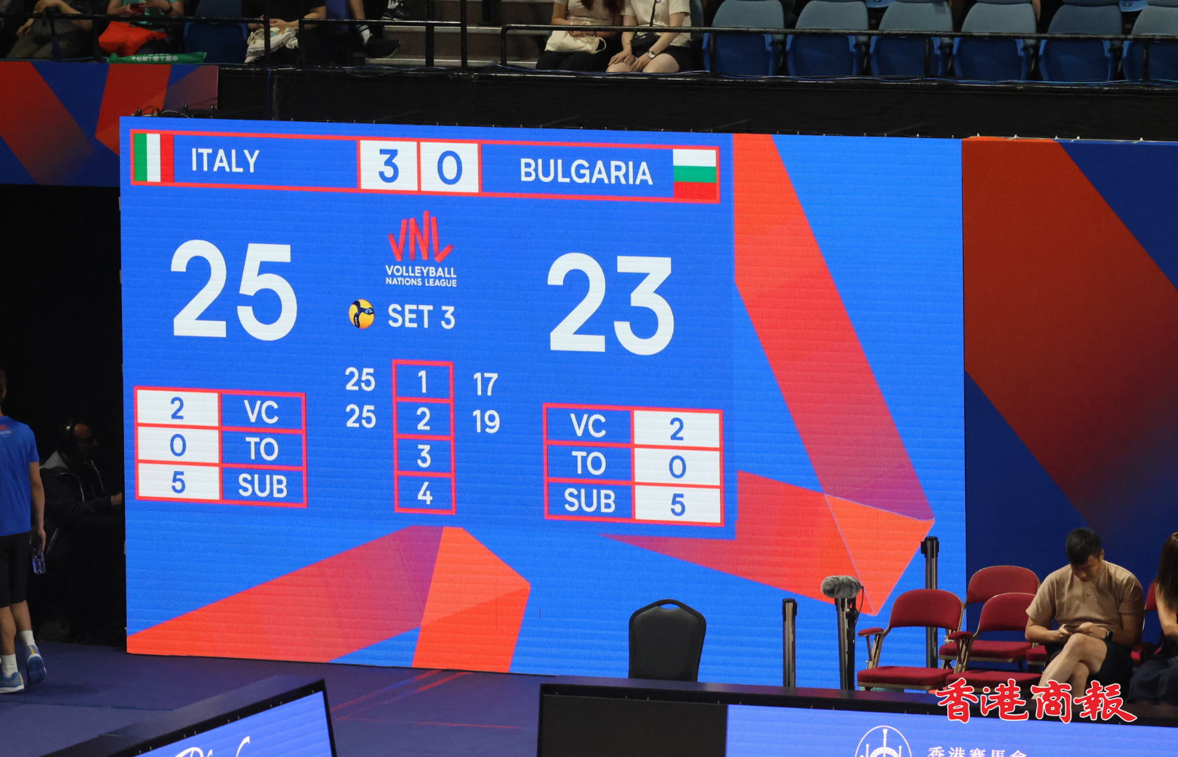 雙方首局互有領先,來到中段,意大利打出一波6比1攻勢,最終以25比17拿下首局。第2局,保加利亞早段取得4比2領先,意大利站穩陣腳後,全面發力隨即反先,以25比19再下一城。第3局,兩隊陷入膠着。爭持激烈,實力佔先的意大利還是保住優勢,結果以25比23拿下第3局,贏得勝利。(文、圖:志誠)