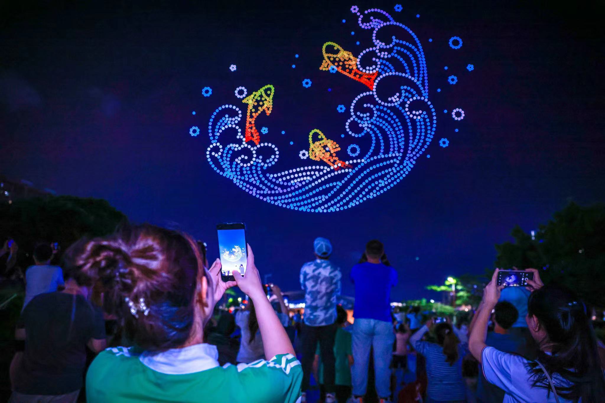 除了賽事外,自6月19日起,2023深圳市龍舟文化藝術節系列活動——數字畫卷《光影萬象·大美龍華》在龍華文體中心凌空起飛,市民們仰望、駐足彷彿置身於神奇的幻境中。據悉,該活動18日-20日連飛三天,無人機以燈光渲濃意,以色彩傳真情,以光影頌華章,在夜空中聚散成河,瞬息閃爍變幻。