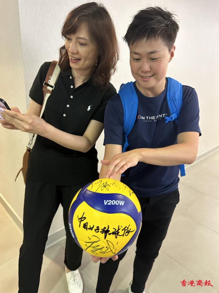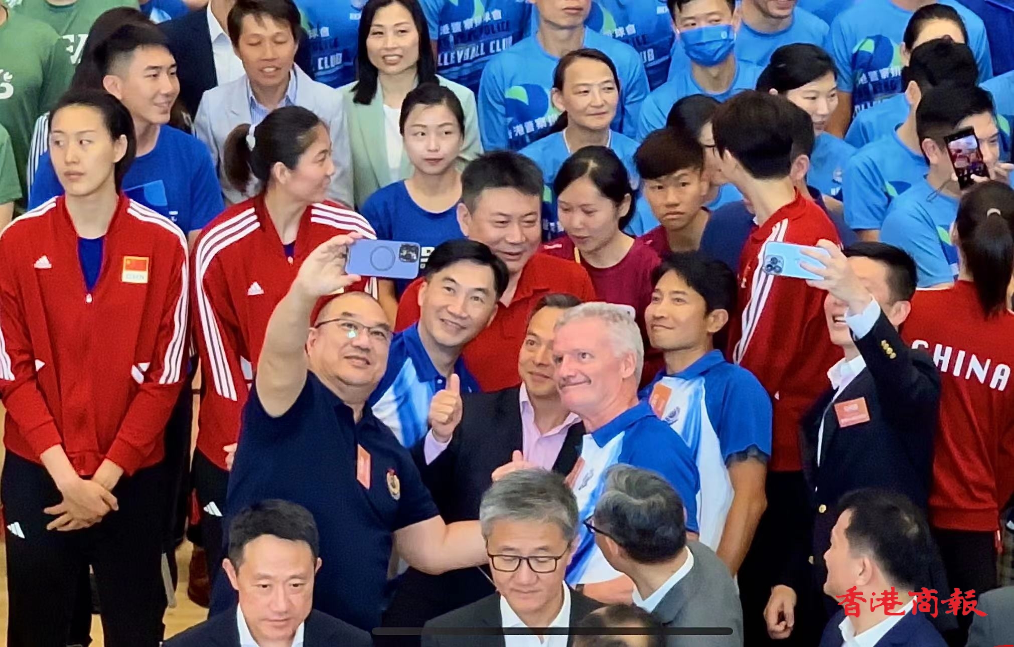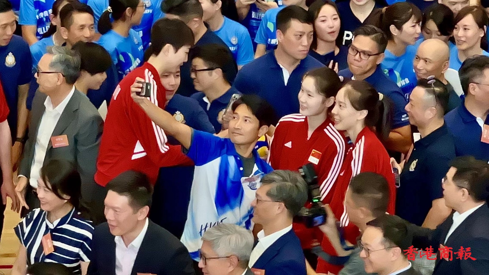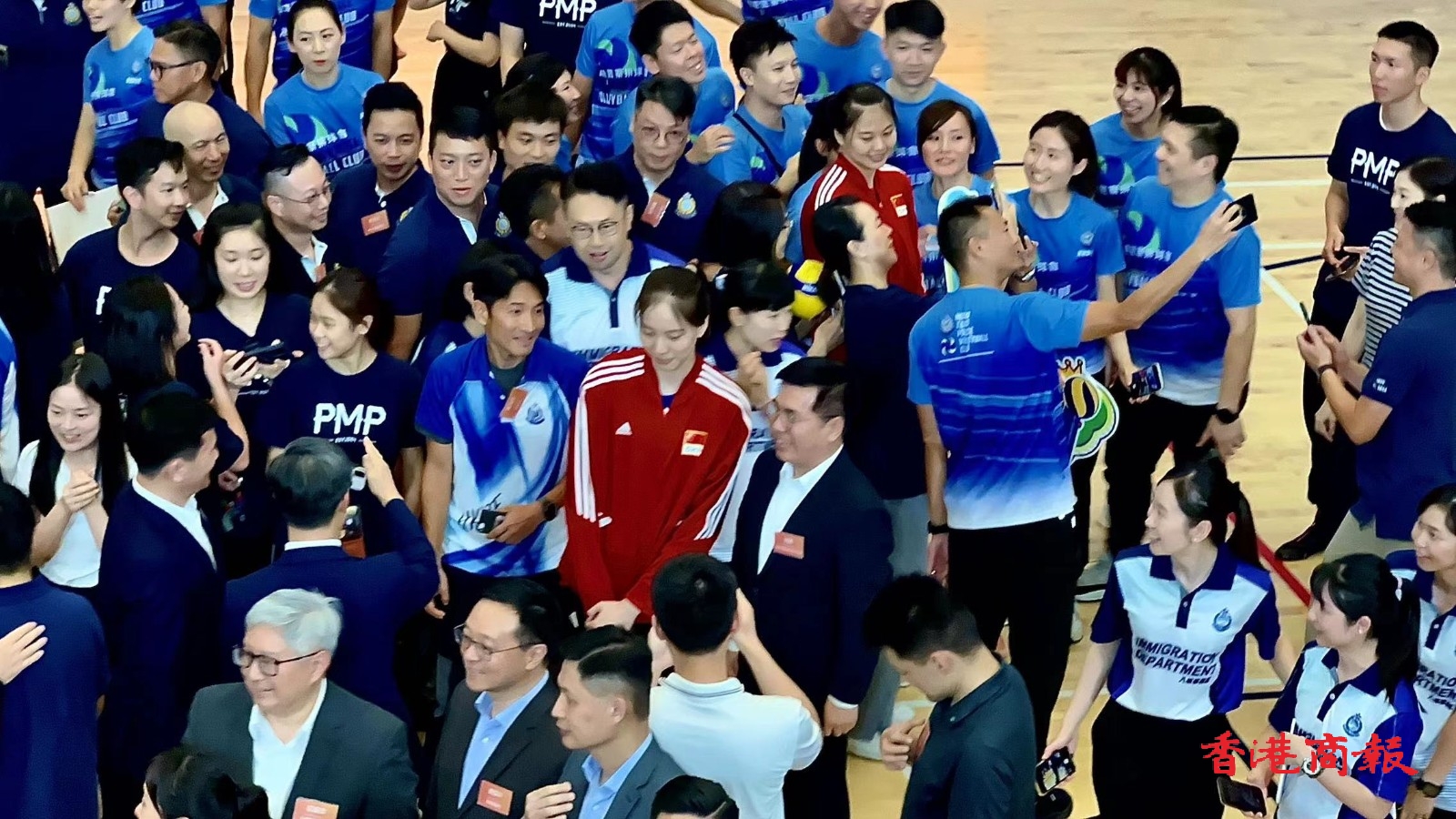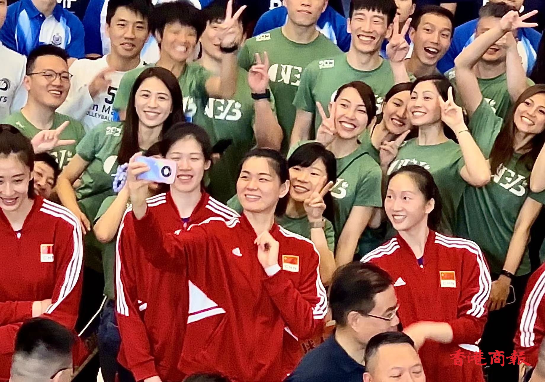 現場還出動無人機記錄珍貴的一刻,五大紀律部隊的代表們更是興奮不已,除了下場打「友誼波」, 還抓緊機會拍合照拿簽名。 姑娘們毫無架子,來者通通不拒,甚至還拿出手機一起玩自拍,大家打成一片,現場笑聲不斷。(記者木子 Sonia)