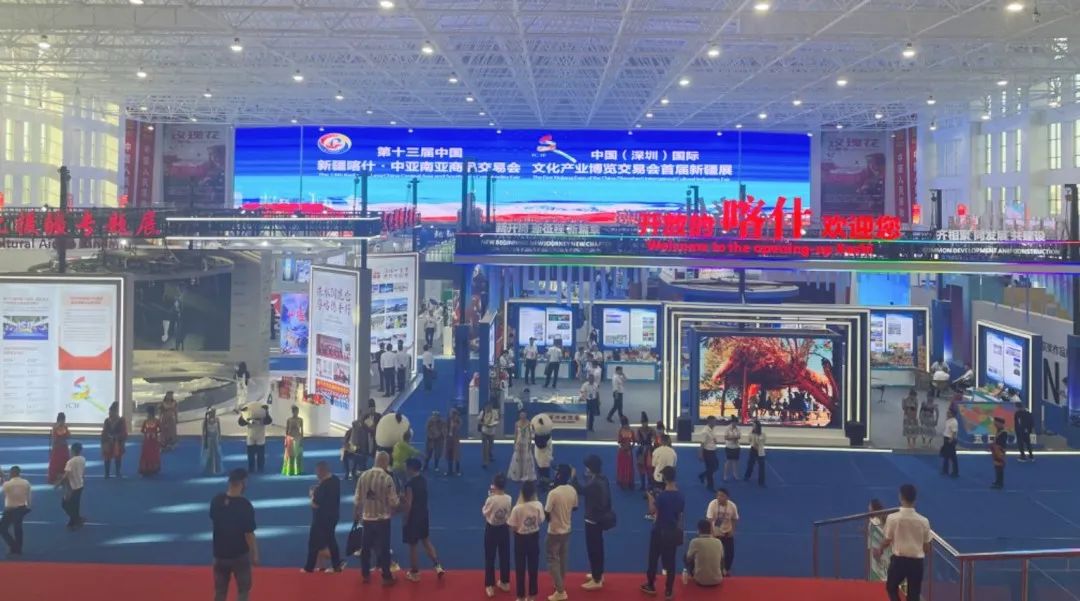 從喀什國際會展中心的主入口走進去,映入眼帘的是文化援疆專題展和「喀交會」主題形象館兩個並排的展台。跟隨觀展人群走近文化援疆專題展展台,一抬眼就看見數字大屏上播放着深圳原創舞劇《詠春》《深AI你》和電視劇《青春之城》,讓四方賓客在展會上就能感受到來自粵港澳大灣區最新的文藝風潮。