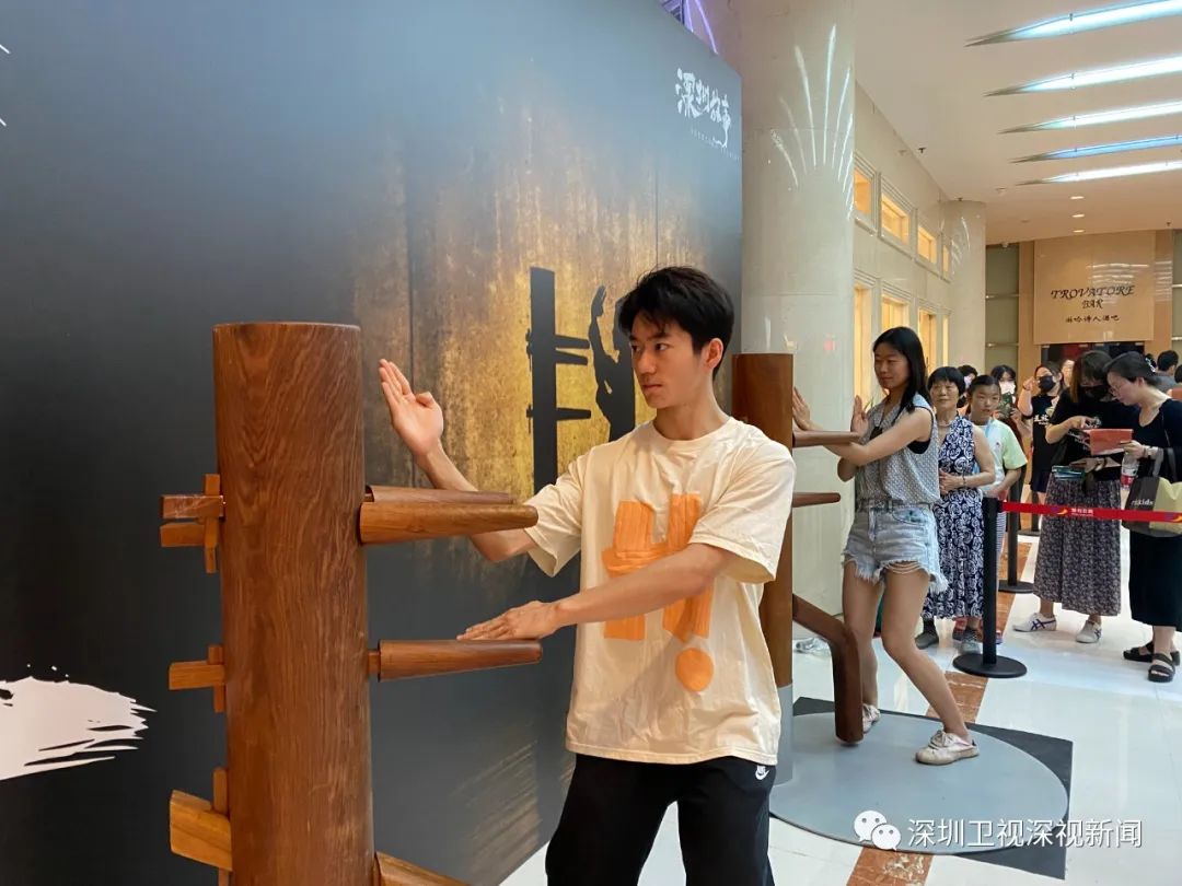觀眾熱情澎湃地打卡海報展板,購買《詠春》周邊產品、上場挑戰打樁等,熱鬧非凡。