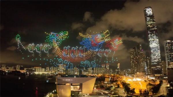 「濃濃粽葉香,歲歲皆安康,擂鼓賽龍舟,希望寫香江」,夜空中,無人機隊組合成多種色彩艷麗的圖案,為香港市民送上端午祝福。