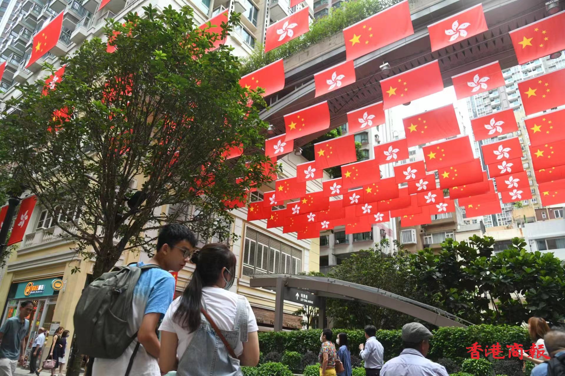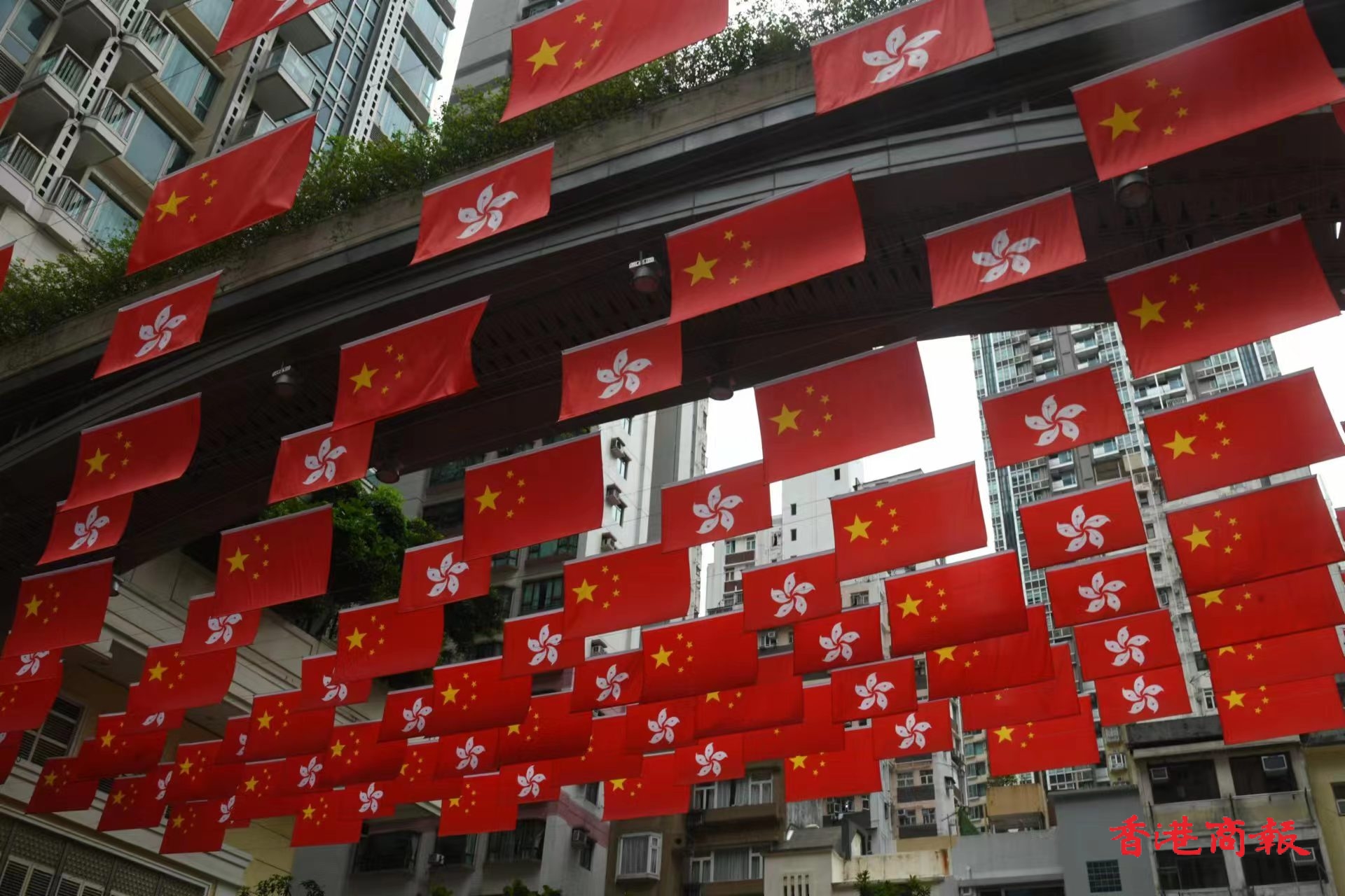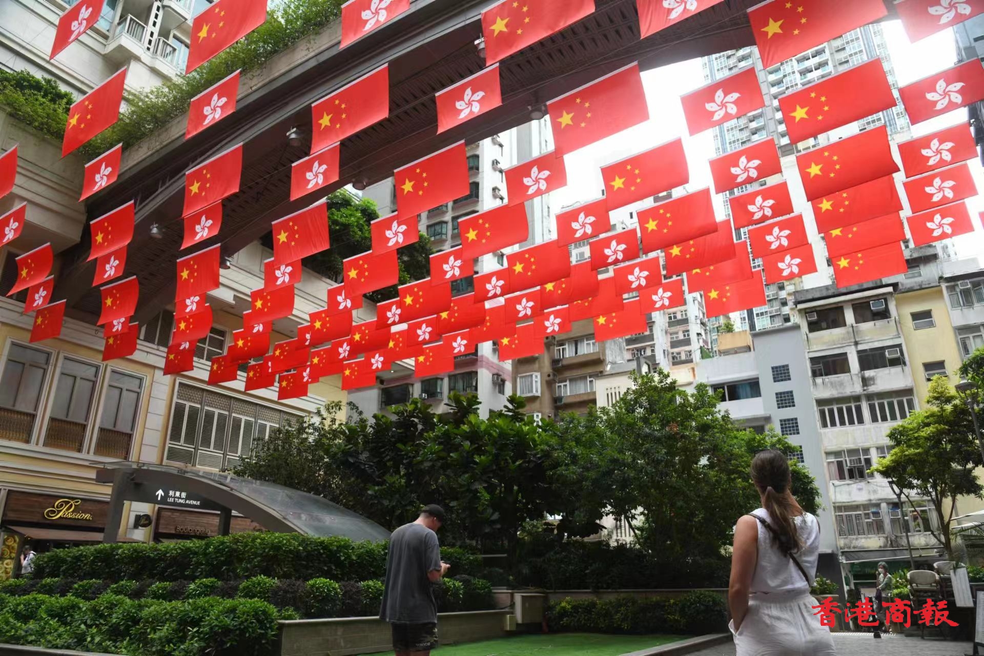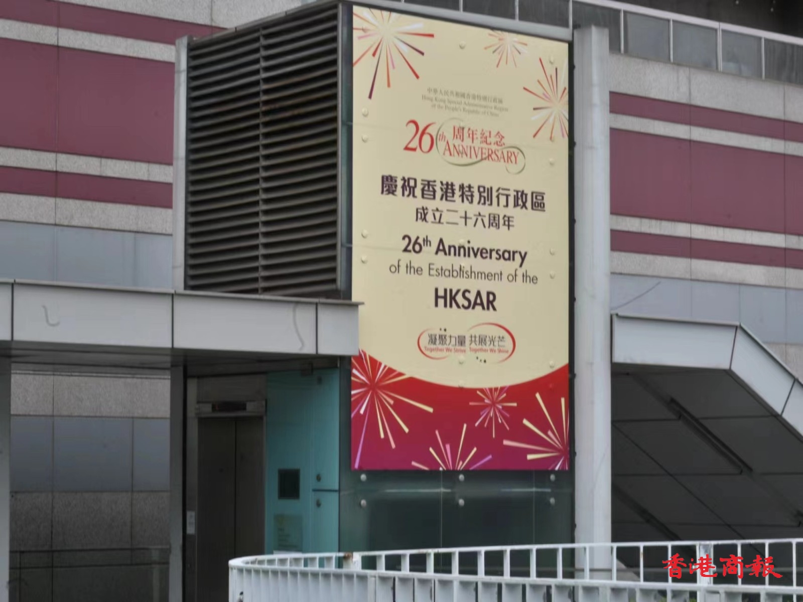 今年是香港回歸祖國26周年,也是香港特別行政區成立26周年,本港街頭一片喜慶氣氛。大大小小的街道掛滿了國旗和區旗,同時還有慶祝香港回歸祖國26周年的巨幅標語,市民可一同感受街頭的節日氣氛,體驗「旗海」現場。(記者 蔡啟文攝)