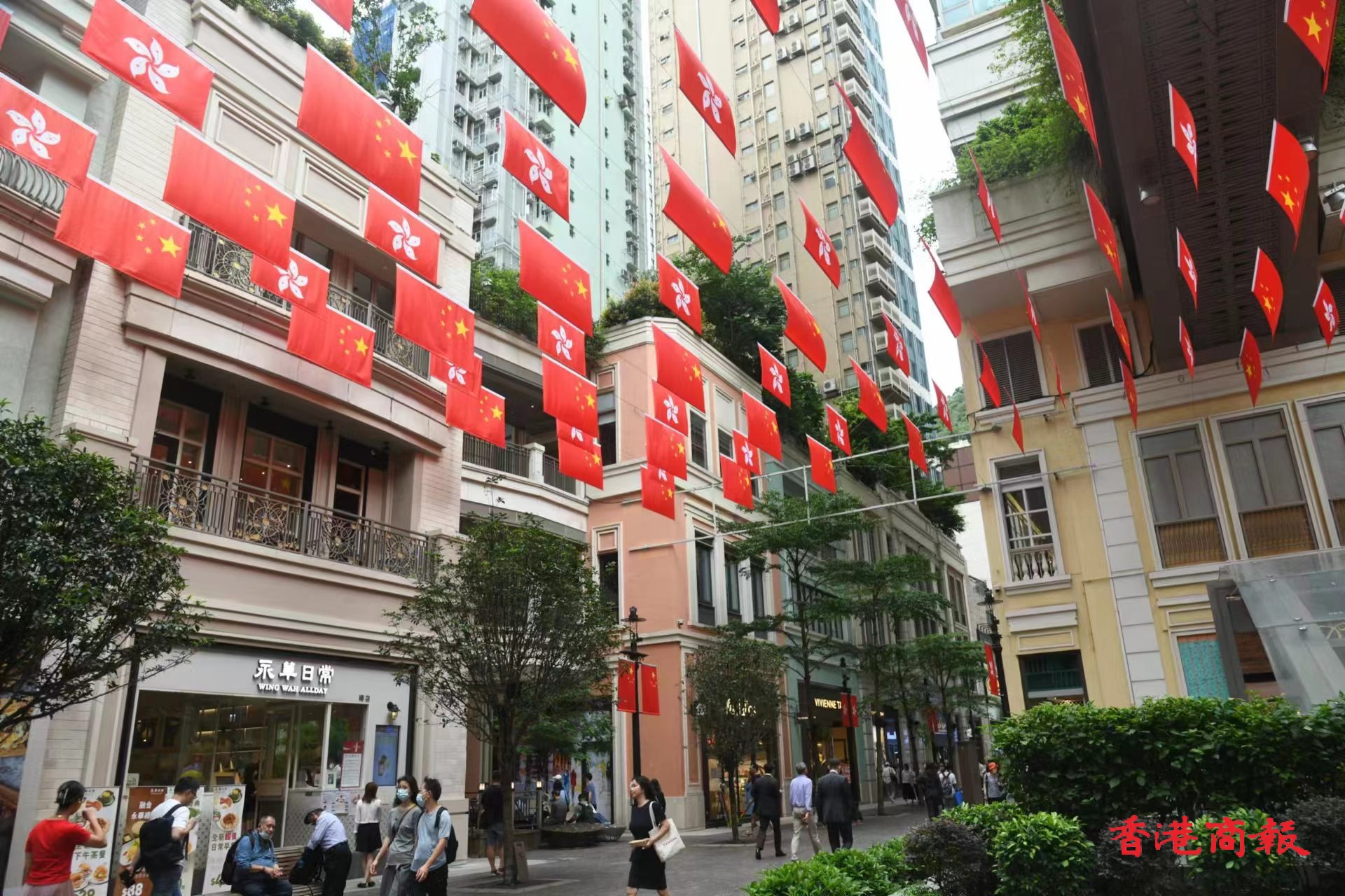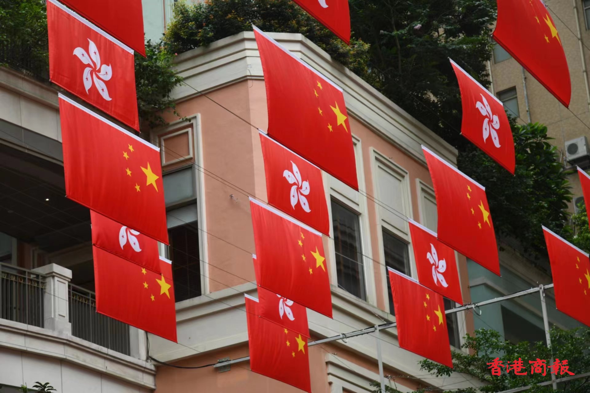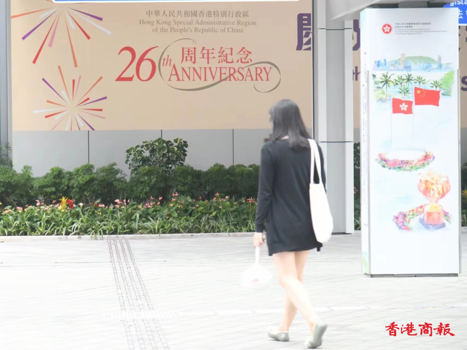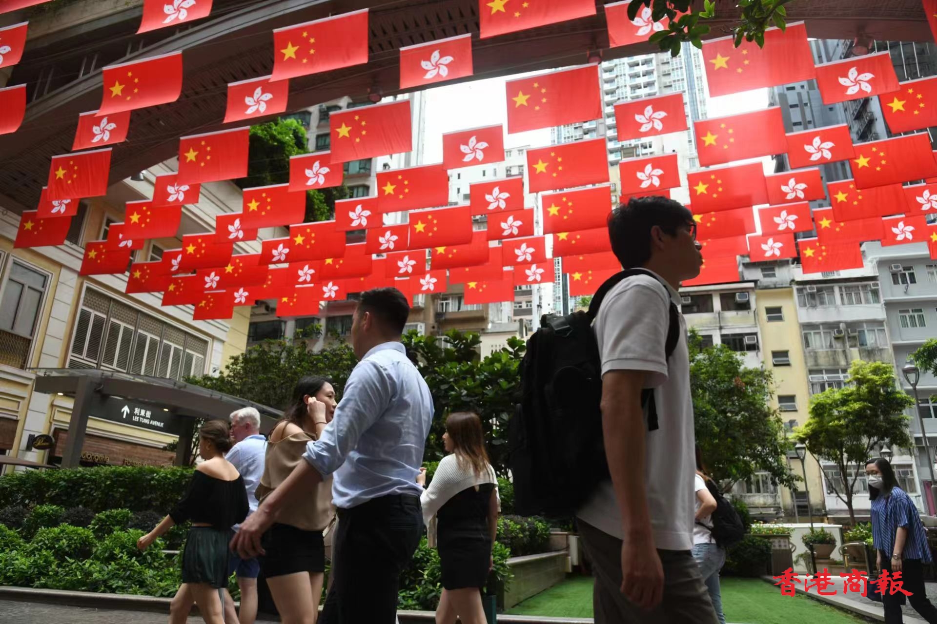 今年是香港回歸祖國26周年,也是香港特別行政區成立26周年,本港街頭一片喜慶氣氛。大大小小的街道掛滿了國旗和區旗,同時還有慶祝香港回歸祖國26周年的巨幅標語,市民可一同感受街頭的節日氣氛,體驗「旗海」現場。(記者 蔡啟文攝)