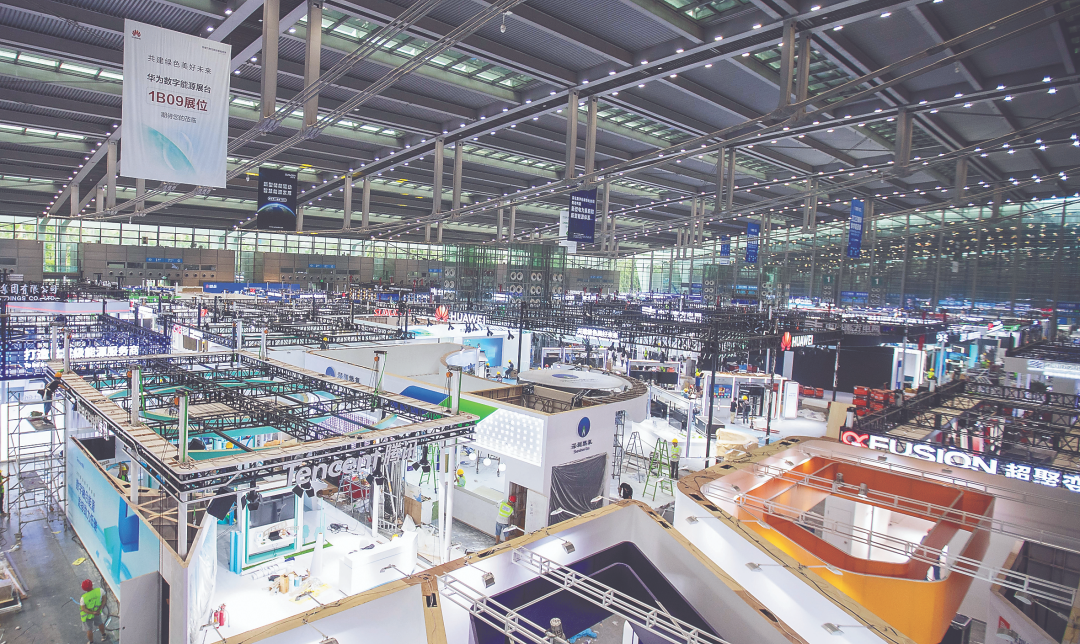 位於深圳會展中心(福田)1號館、2號館,即將啟幕的2023國際數字能源展一片緊張忙碌景象。深圳特區報記者 賴犁 攝