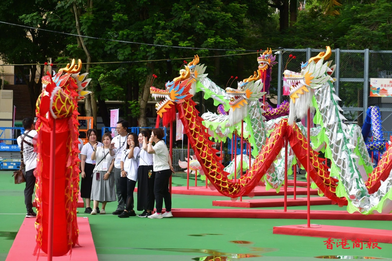 維園2號球場更設有打卡區,內有本地特色大型花牌配合26條傳統舞龍。記者 崔俊良攝