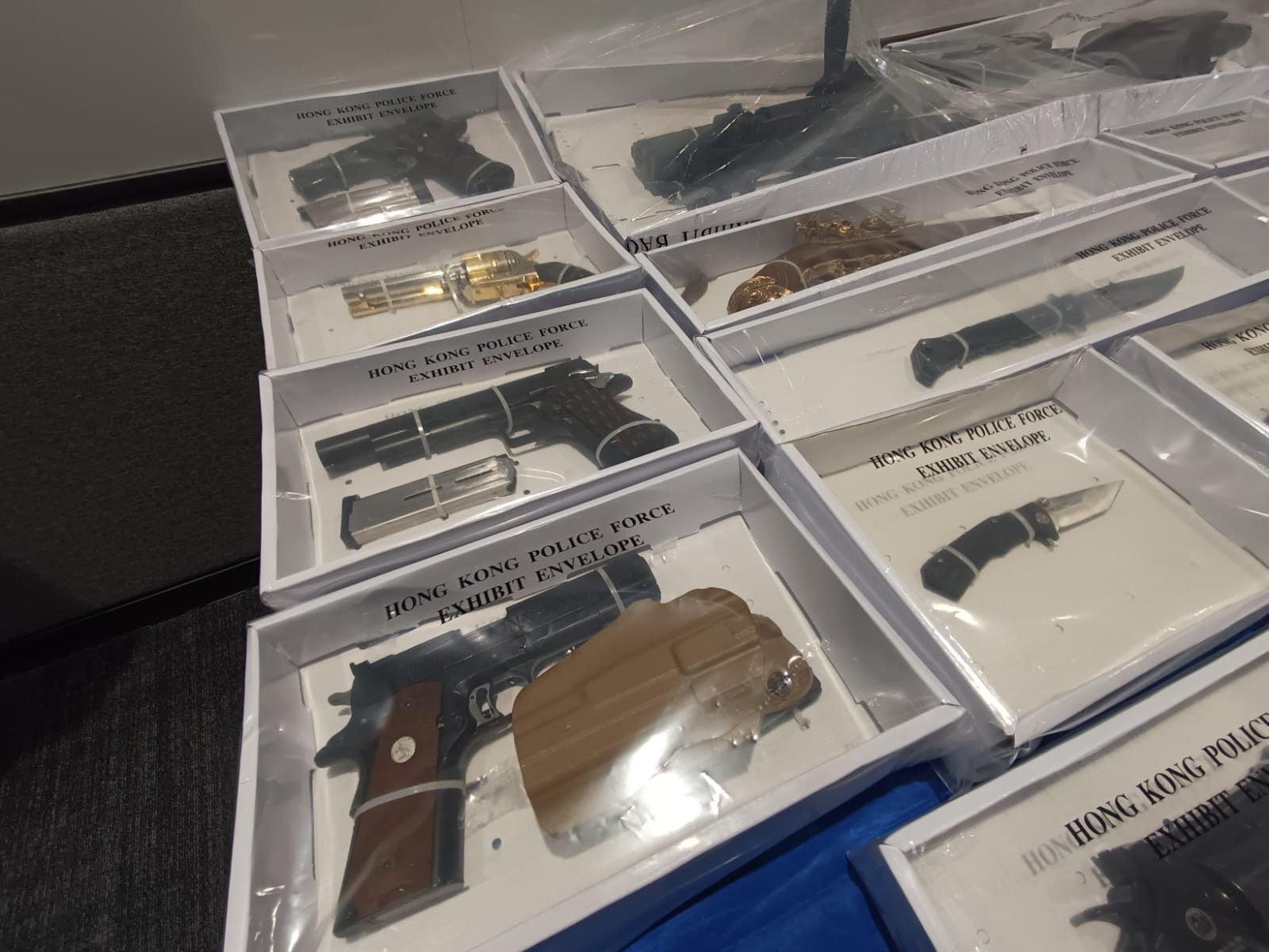 經調查後,在單位內拘捕一名41歲男子,涉嫌「管有違禁武器」「管有攻擊性武器」和「管有仿製槍械」罪。被捕男子報稱任建築工人,無黑社會背景,現正被警方扣留調查。