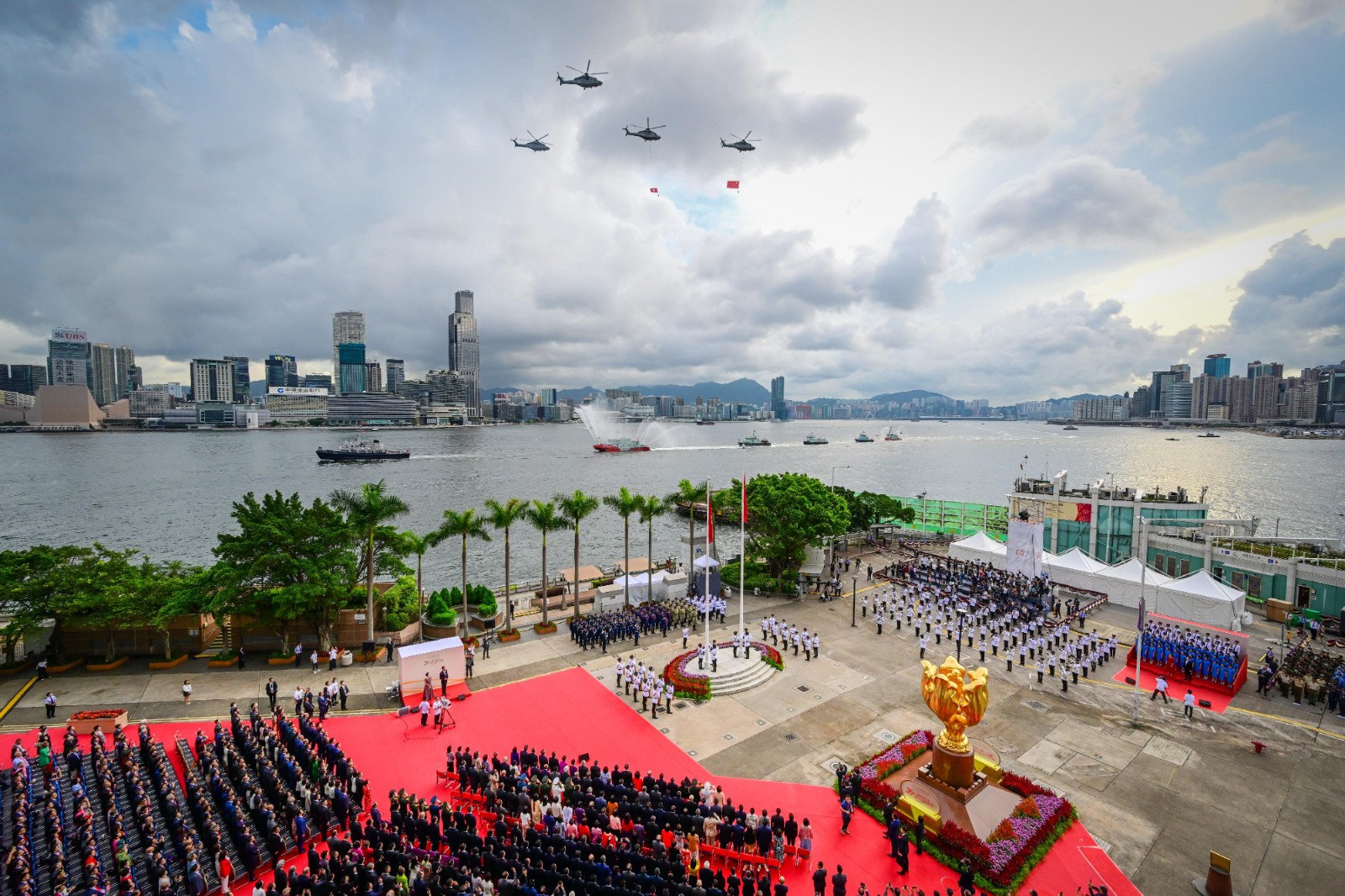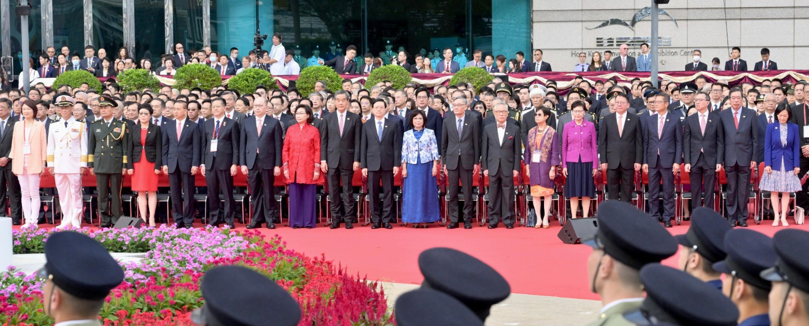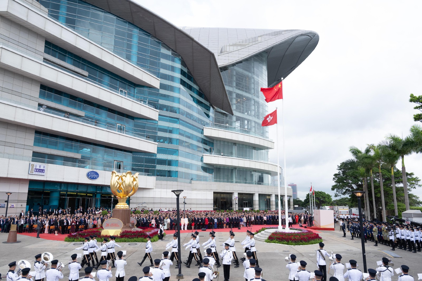 警察銀樂隊現場奏樂,護旗方隊及儀仗隊以中式步操進場,護送國旗和區旗到旗桿位置,全體嘉賓肅立,面向國旗和區旗,在歌唱家陳永和譚樂軒的領唱下,唱國歌;國旗和區旗升上旗杆頂後,紀律部隊在空中和海上敬禮,飛行服務隊多架直升機分別懸掛國旗及區旗,飛越維港上空,消防船及水警輪則在會展對開海面噴水花致敬。