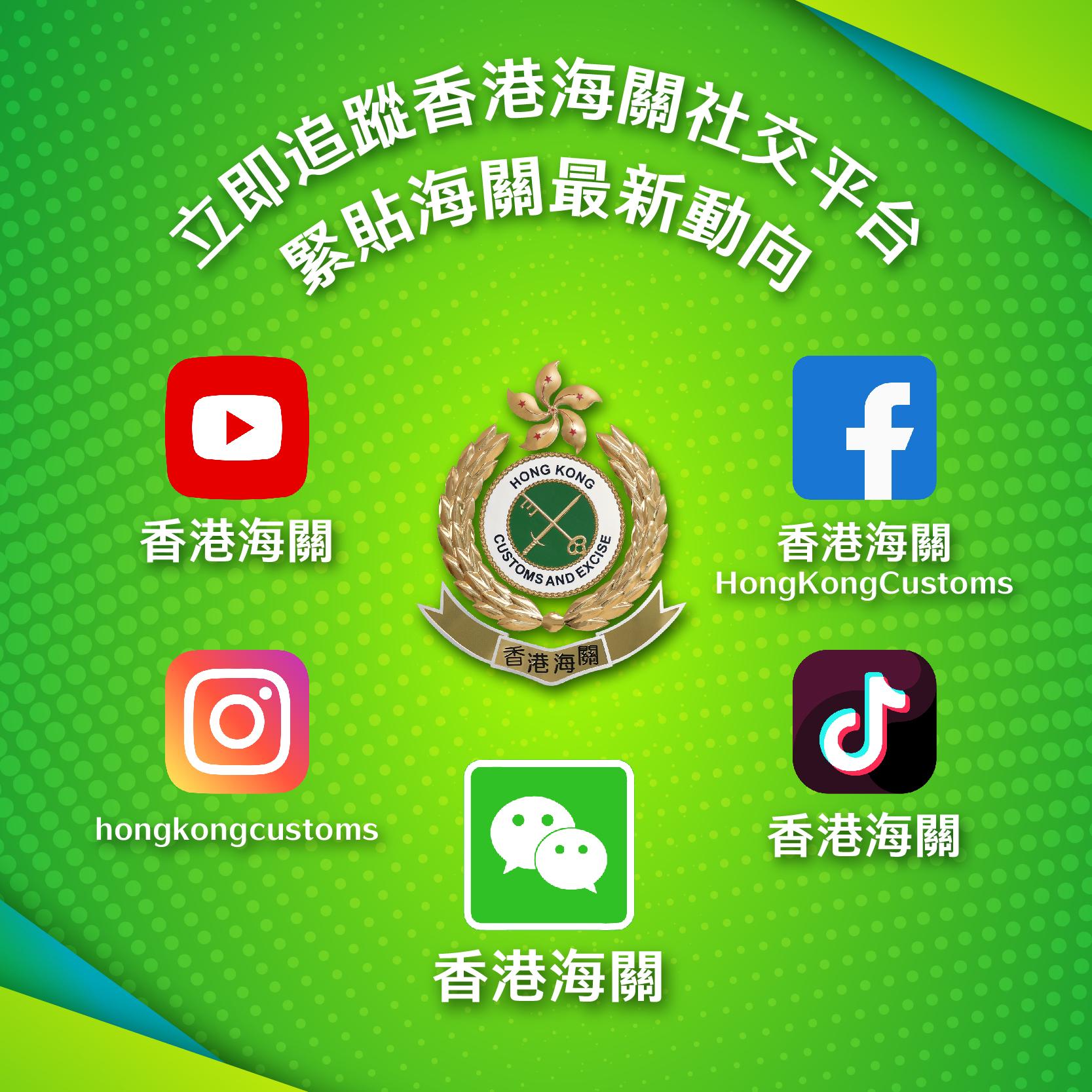 繼開設YouTube頻道、Facebook專頁、Instagram賬戶及抖音官方賬號後,海關開設微信官方賬號,作為第5個社交媒體官方平台,進一步加強海關與公眾的溝通和聯繫。海關會利用微信官方賬號發布部門多元化的工作和最新資訊,接觸更多香港及內地民眾,推廣海關專業形象,並讓公眾掌握更多有用的海關資訊。