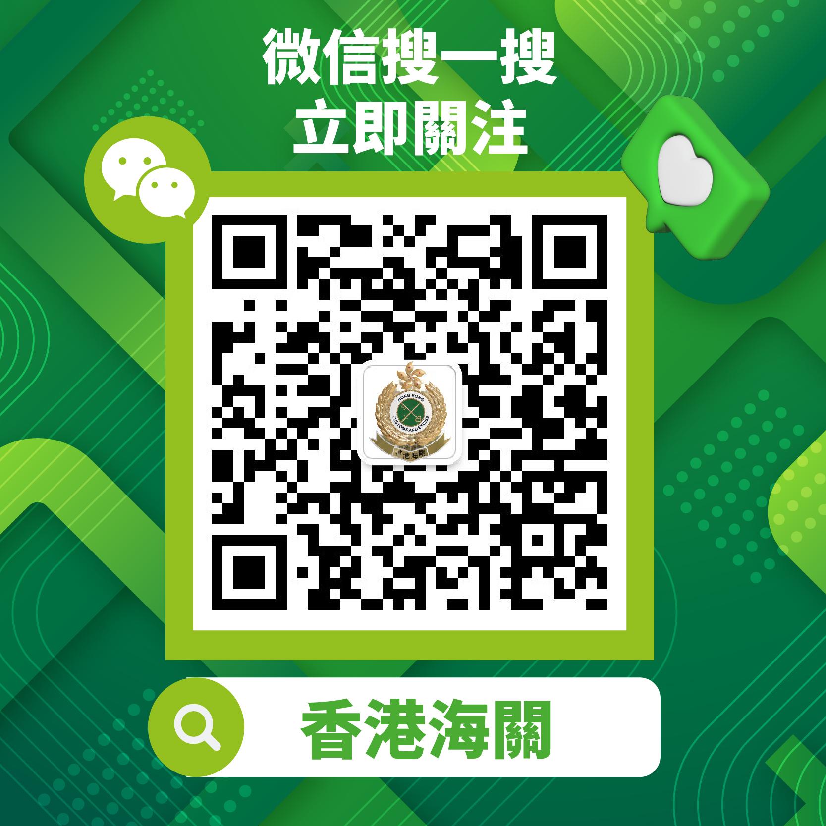 歡迎公眾透過二維碼瀏覽、關注及分享「香港海關」微信官方賬號的資訊。