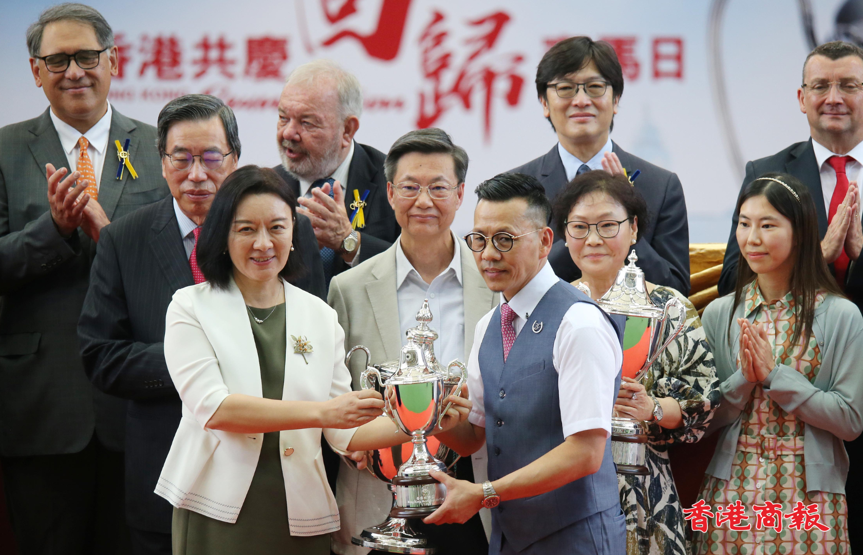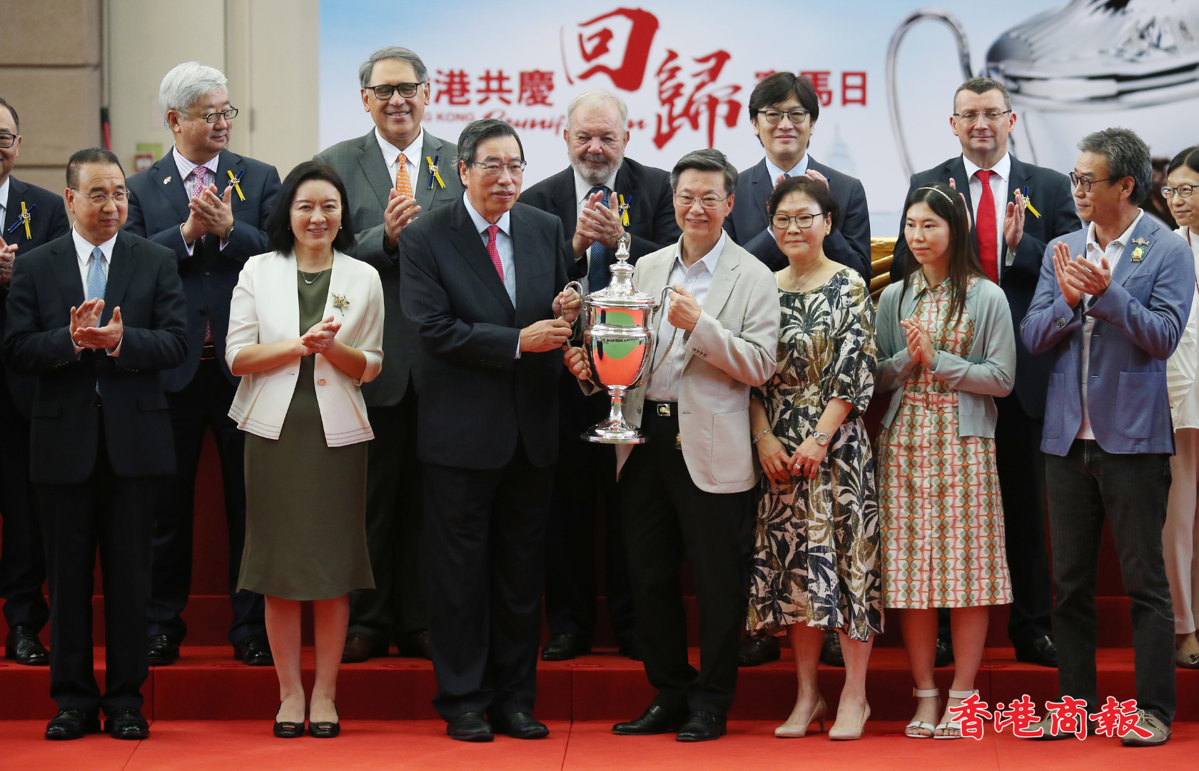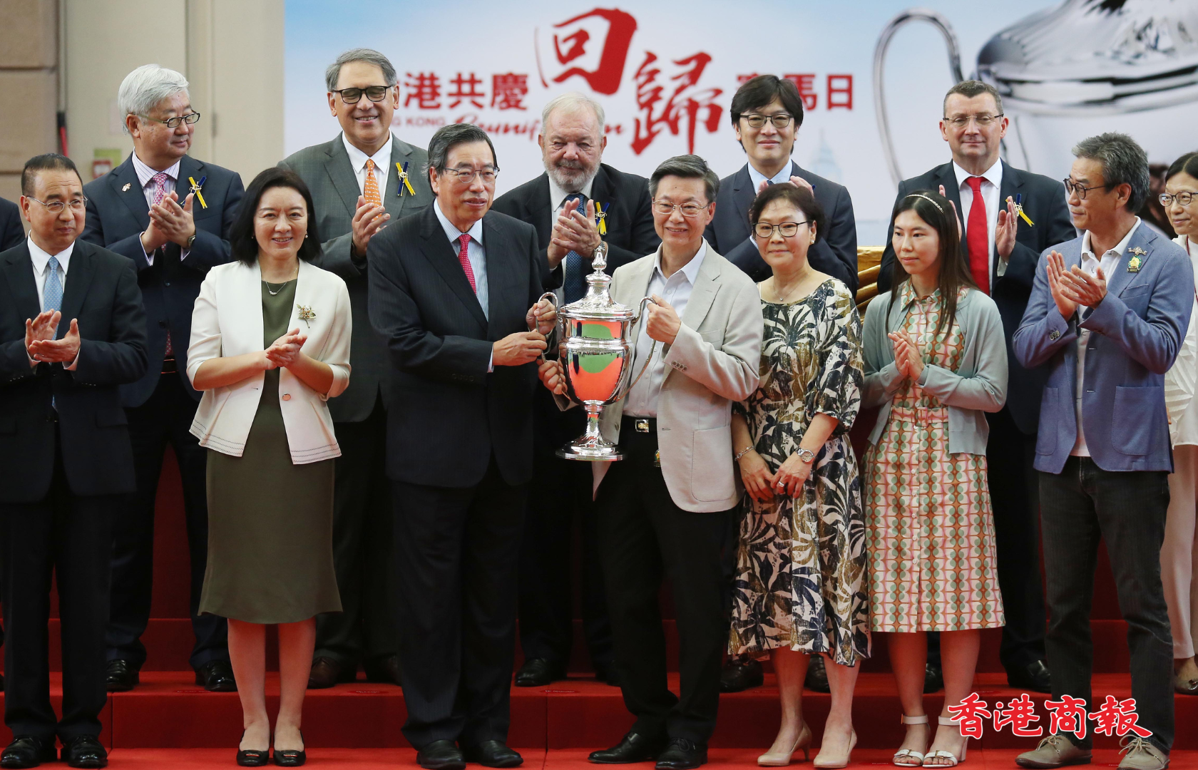 中聯辦副主任盧新寧、外交部駐港公署特派員劉光源以及立法會主席梁君彥議員,賽後出席頒獎儀式,分別頒發獎盃予勝出馬匹「知足常樂」馬主、練馬師羅富全及騎師潘頓。(文、圖、影片編輯:志誠)