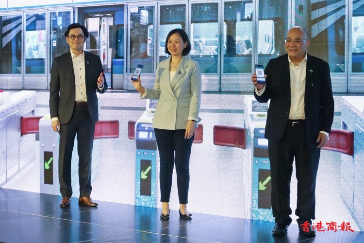 港鐵公司機場鐵路總管王家明、港鐵公司香港客運服務總監楊美珍和港鐵公司車務總監李家潤進行啟動禮。