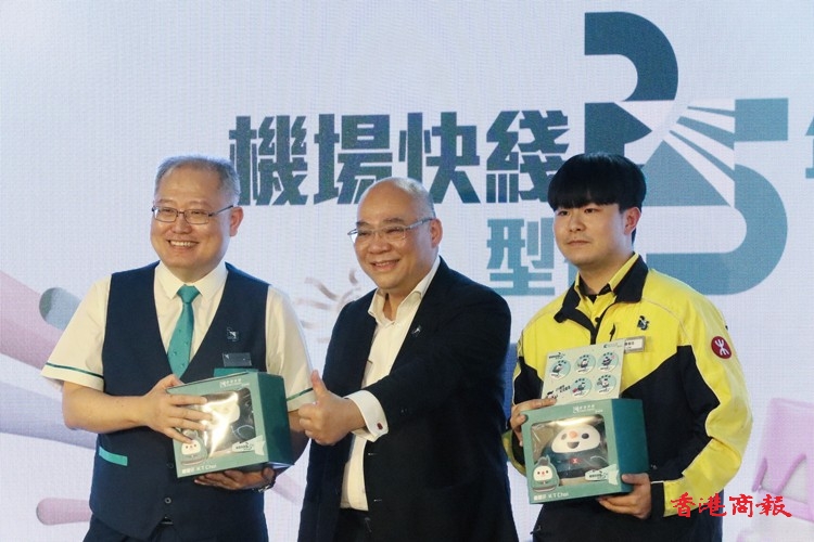 楊美珍其後聯同港鐵公司車務總監李家潤和港鐵公司機場鐵路總管王家明進行啟動儀式,3人各自手持手機,把屏幕掃描身後模擬閘機二維碼,啟動機場快線型祝25年邁向新旅程之旅。
