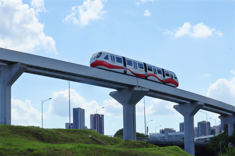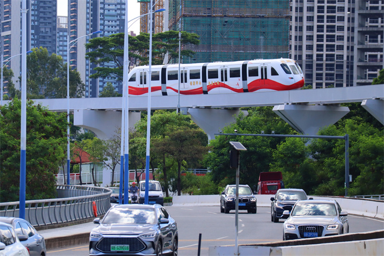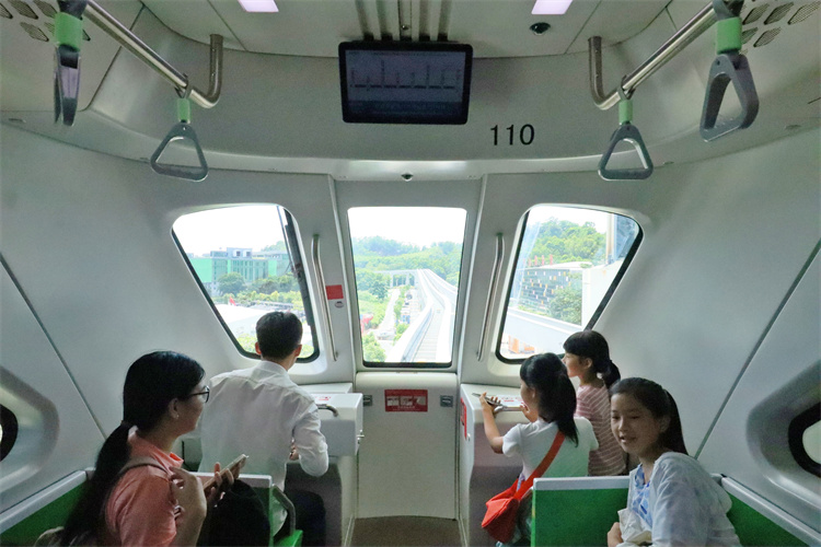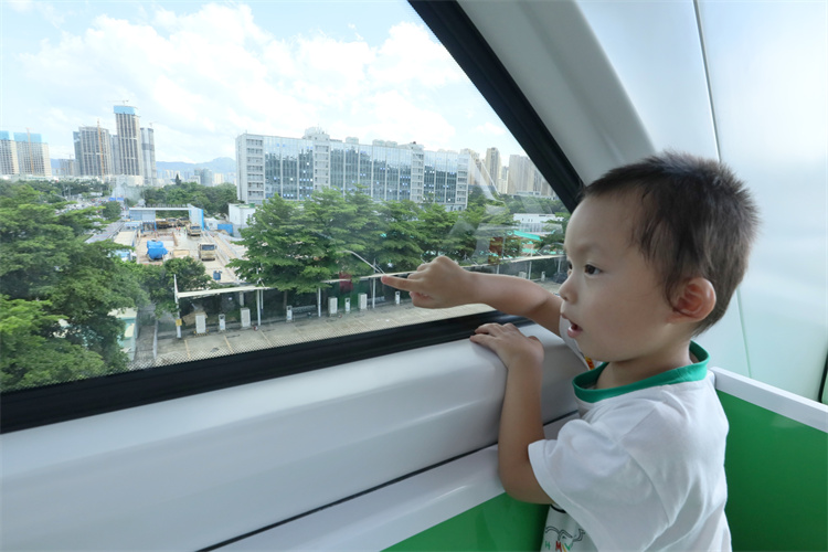 坐上列車,穿梭於城市,靠着窗往下看,看到的不是軌道,而是相距10多米的地面,有種離地懸空的感覺。沿途的風景也不錯,有不少家長帶着孩子過來試坐,車頭的「觀光位」是視野最好的位置,許多小朋友都會爭坐,一嘗當列車「司機」。(馮瀚文攝)