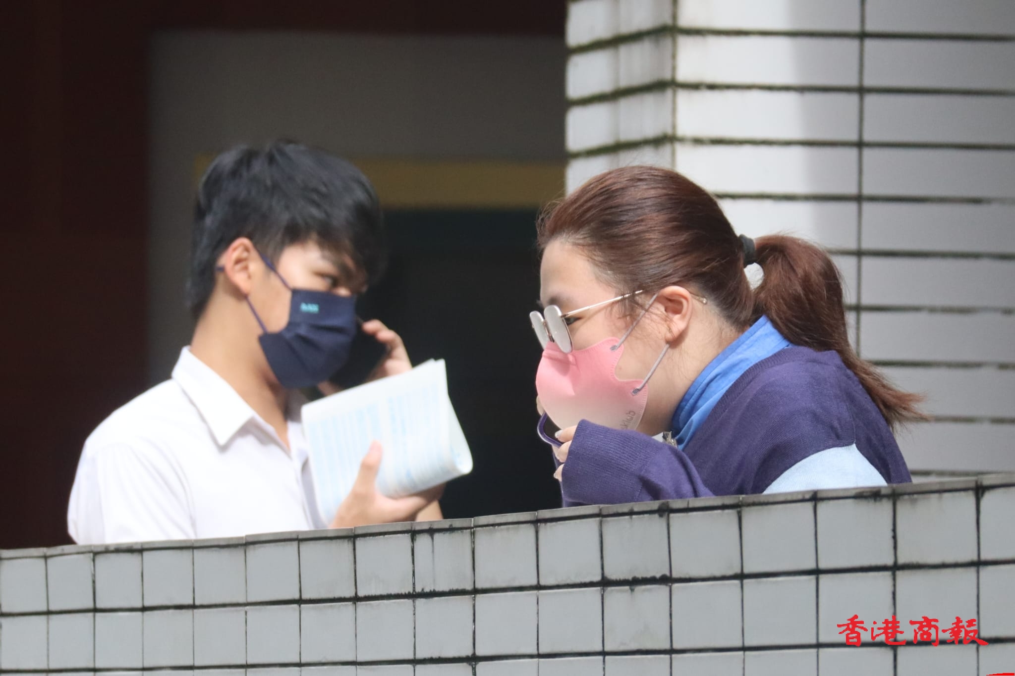 19日中學文憑試放榜,當日早上在聖保羅男女中學,有學生回校接獲成績單後落淚,也有學生互相擁抱安慰對方。(記者 馮瀚文攝)