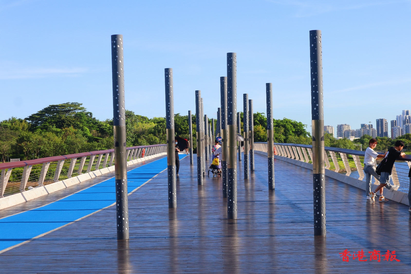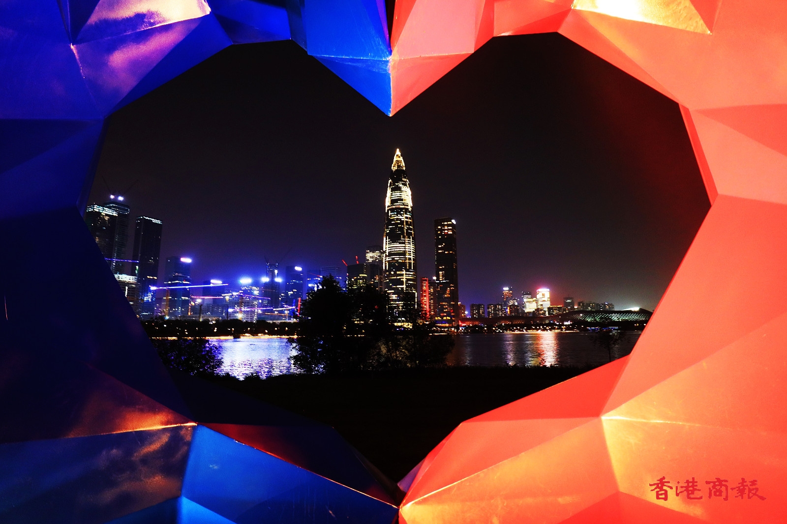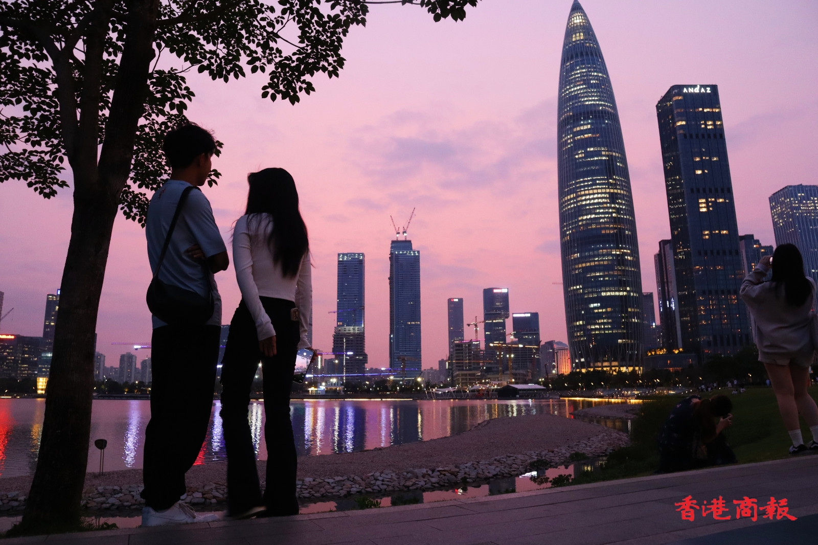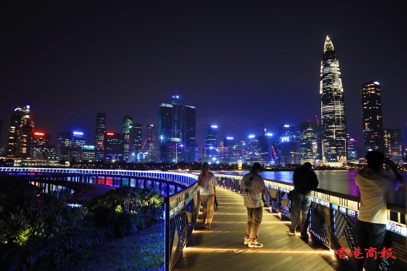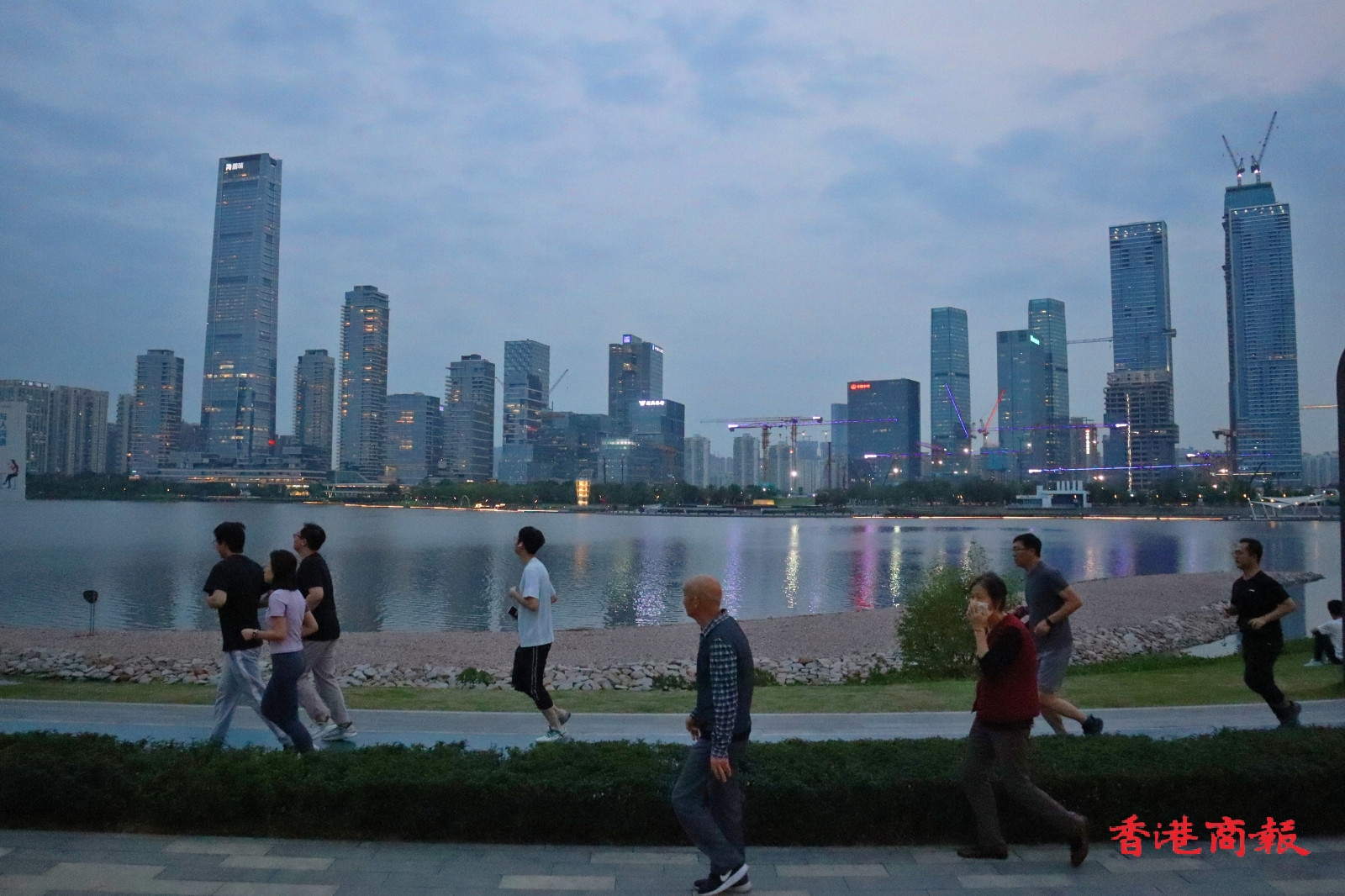 公園內的水域寬闊,對岸的高樓大廈一覽無遺,是觀賞深圳夜景的好去處。太陽落下,晚霞爬上天空,亮起燈光的高樓璀璨閃耀,晚霞與燈光一同倒映在水中,景色令人着迷。(馮瀚文攝)