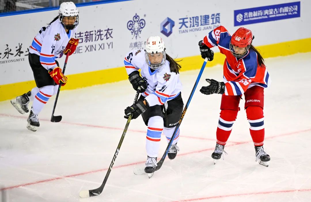 第十四屆全國冬季運動會女子冰球(公開組)比賽,廣東隊對戰河北隊。新華社記者 貝赫 攝