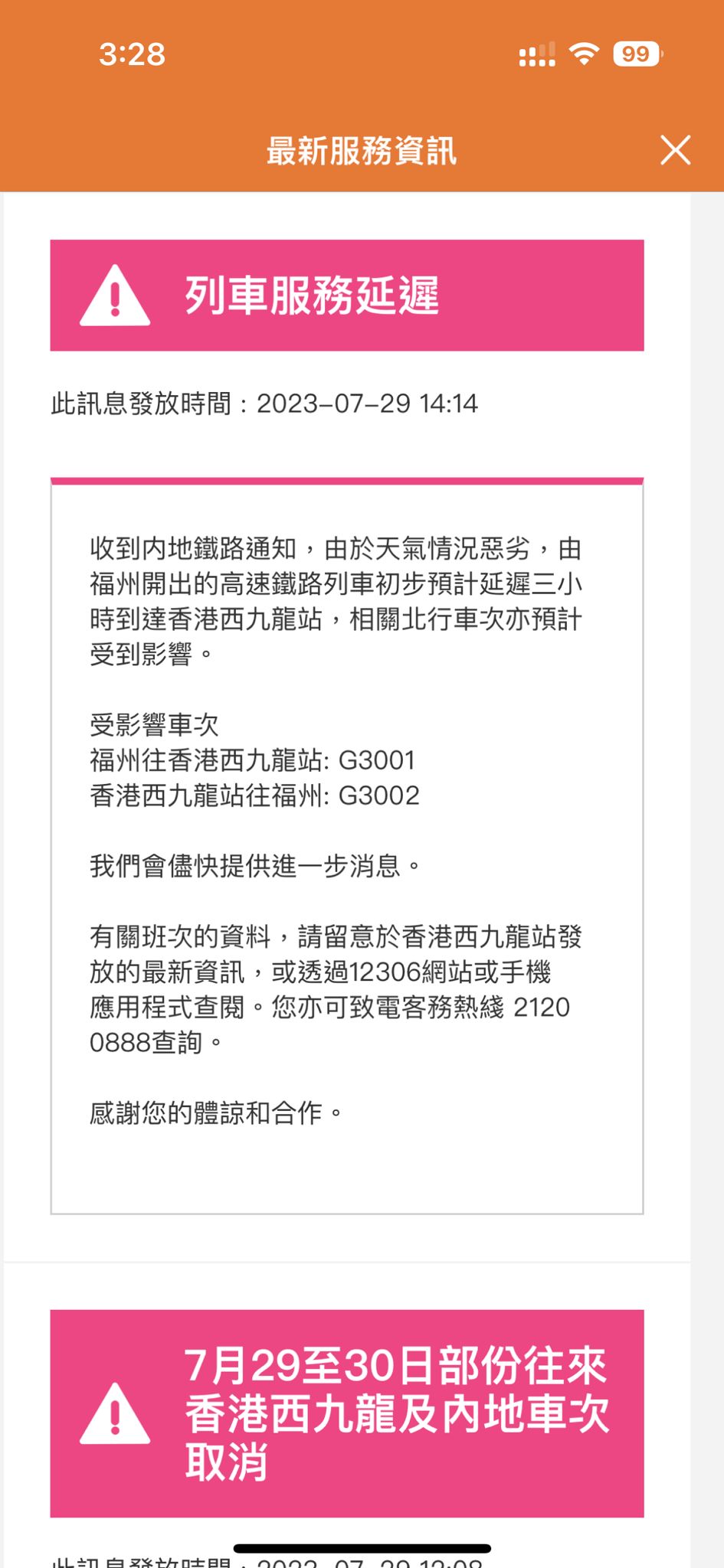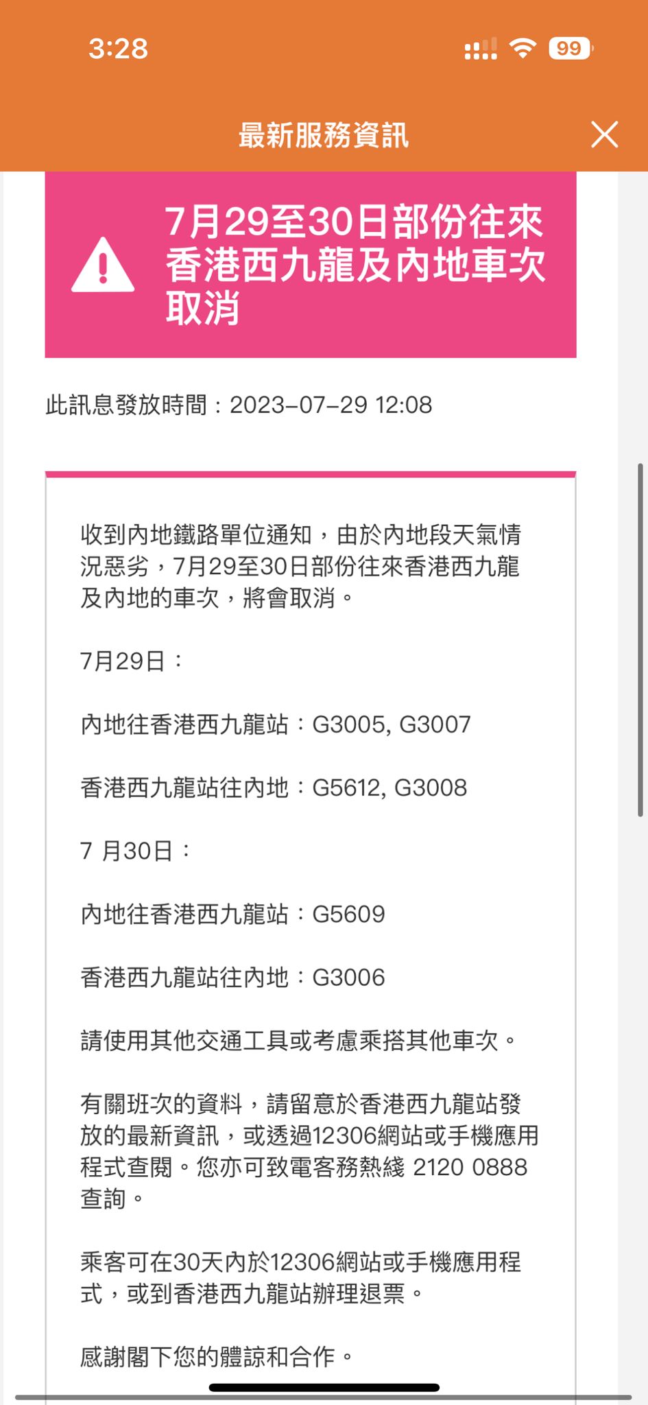 7月30日,由深圳北到香港西九龍站G5609號列車,及由香港西九龍站往廈門G3006號列車將會取消。