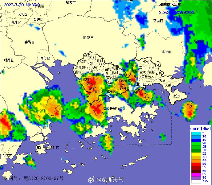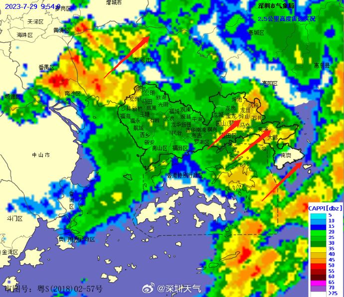 深圳市中西部地區已出現強降水並將擴展至東部地區,預計全市大部1-2小時內還將出現30-50毫米降水,深圳市氣象台2023年07月29日08時05分在南山區、福田區和寶安區將暴雨黃色預警信號升級為橙色,並在羅湖區、鹽田區、龍崗區、坪山區、大鵬新區、大鵬灣海域和大亞灣海域發布暴雨黃色預警信號。全市進入暴雨緊急防禦狀態,請注意防禦強降水及其引發的積澇、山洪等次生衍生災害。