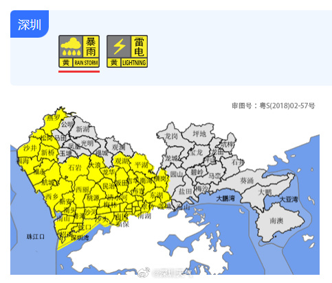 【深圳市分區暴雨黃色預警信號生效中】預計羅湖區、南山區、福田區、寶安區、深圳灣、龍崗區和龍華區2小時內將出現降水,請大家注意防範!