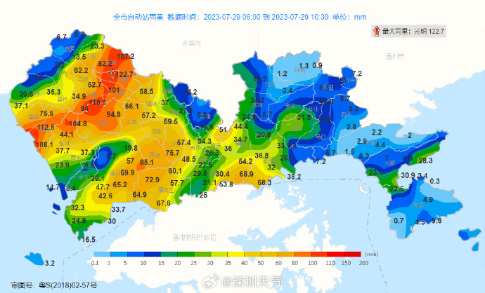 風雨實況:深圳平均雨量32.9毫米,超過100毫米的降雨主要出現在光明區和寶安區,全市最大雨量122.7毫米(光明區光明街道),最大小時雨量101.3毫米(寶安區石岩街道),最大半小時雨量69.5毫米(寶安區航城街道)。