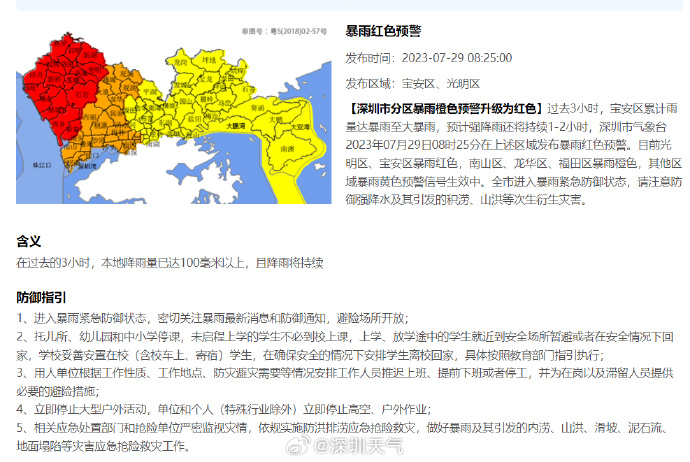 過去3小時,光明區累計雨量已達大暴雨,龍華區已經達到暴雨,預計強降雨還將持續1-2小時,雨量仍有20-40毫米,深圳市氣象台2023年07月29日07時55分將光明區暴雨預警升級為紅色,並將龍華區的暴雨預警升級為橙色。全市進入暴雨緊急防禦狀態,請注意防禦強降水及其引發的積澇、山洪等次生衍生災害。