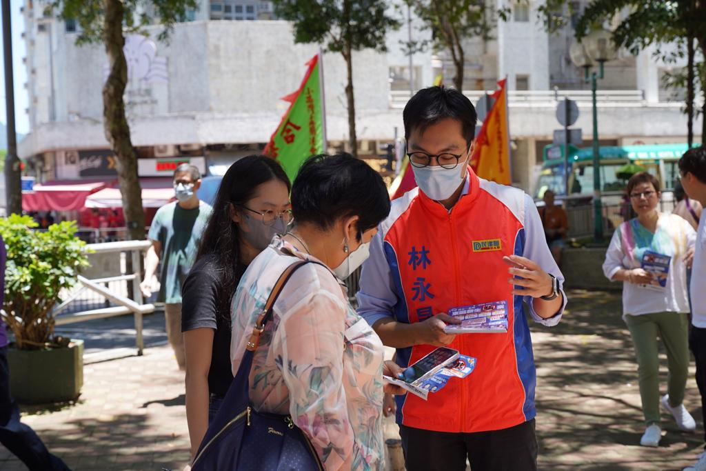 民建聯港島東團隊在小西灣邨派發防騙宣傳單張。馮俊文攝