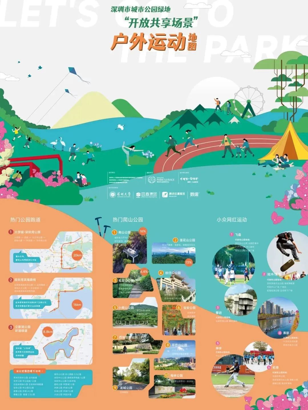 羅湖體育休閒公園、香蜜湖公園香蜜體育中心、大沙河公園體育中心、北站中心公園體育場、寶安公園。