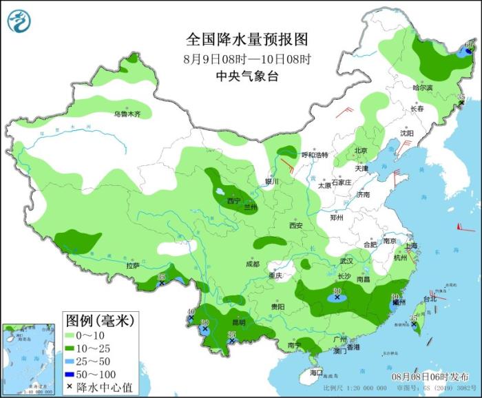 圖1 全國降水量預報圖(8月8日08時-9日08時)