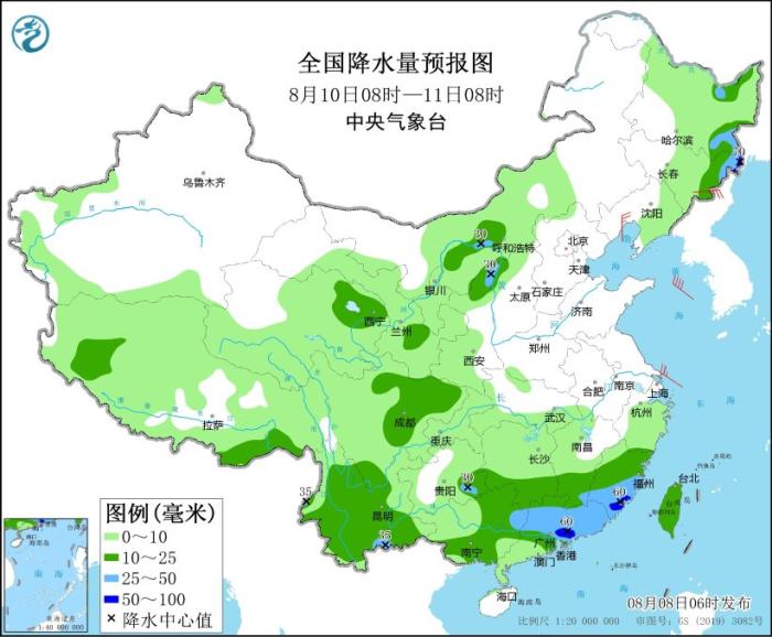 圖2 全國降水量預報圖(8月9日08時-10日08時)