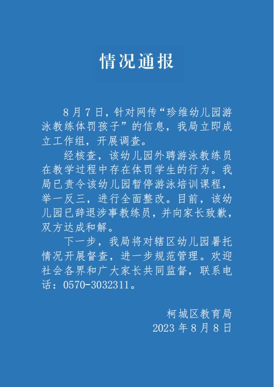 據浙江衢州柯城區教育局微信公眾號消息,8月7日,針對網傳「珍維幼兒園游泳教練體罰孩子」的信息,柯城區教育局立即成立工作組,開展調查。