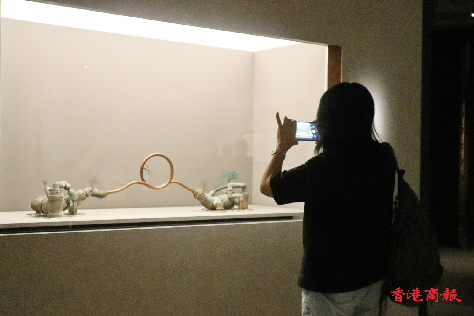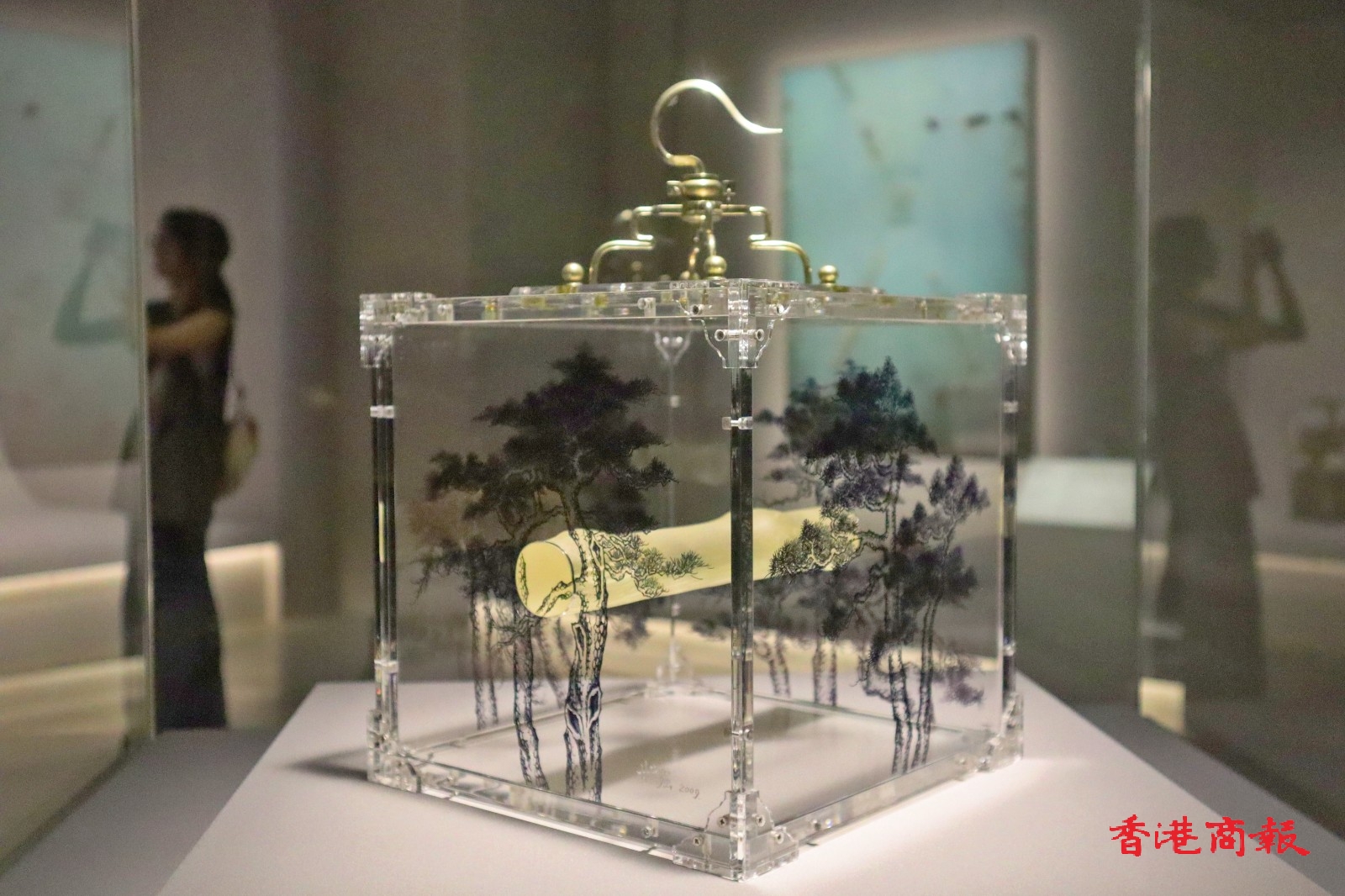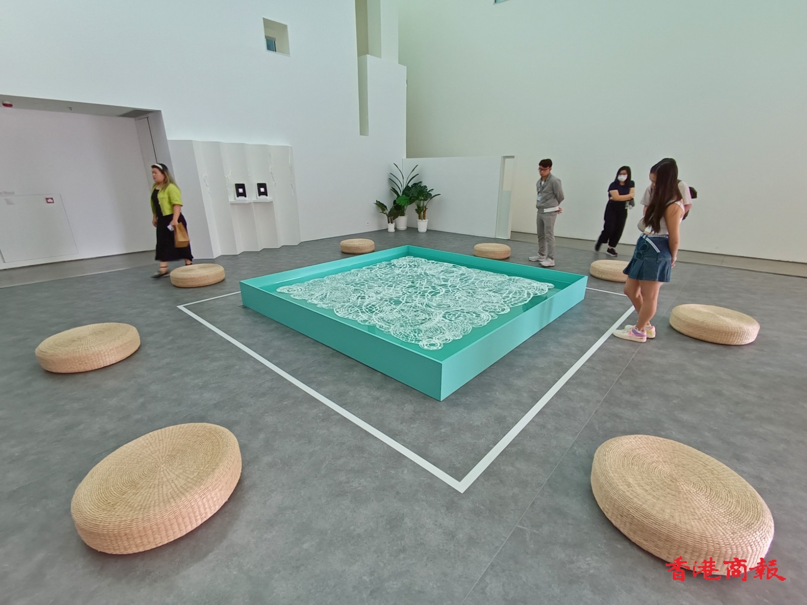 藝術館同時邀請2名香港藝術家阮家儀和李寶怡,以藝術館藏品為靈感創作全新場域特定藝術裝置。阮家儀以現成物製作成可轉動的《登陸何處》,配合燈光投射,在牆身上交疊出一抹夢幻景致,構成她對香港多元文化的體會。剪紙藝術家李寶怡經常往返香港與洛杉磯,她的作品《鳥語·花香》以人手剪出一個層層漣漪的大池塘,並以擴增實境建構一個鳥語花香的世界,以現代美學守護及發揚中國傳統工藝,作品亦反映她在異鄉對故土的尋根之情。(記者 馮瀚文攝)