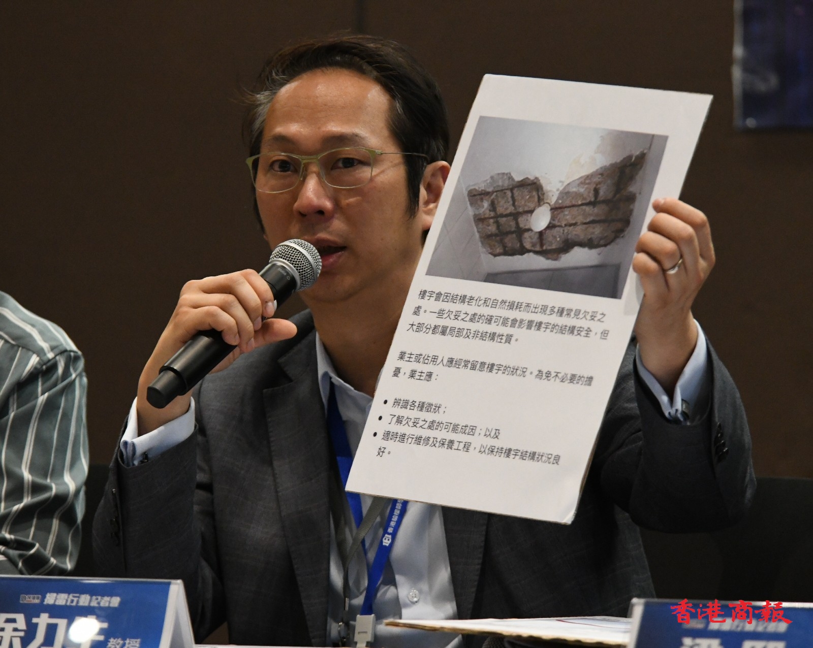 民建聯立法會議員梁熙聯合香港驗樓師學會,為港島東50棟大廈義務進行樓宇快測,今日在記者會公布結果。記者 蔡啟文 攝