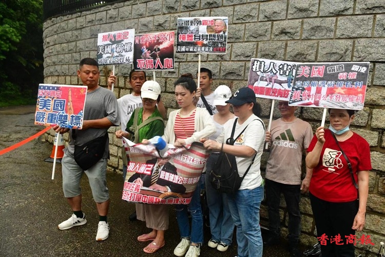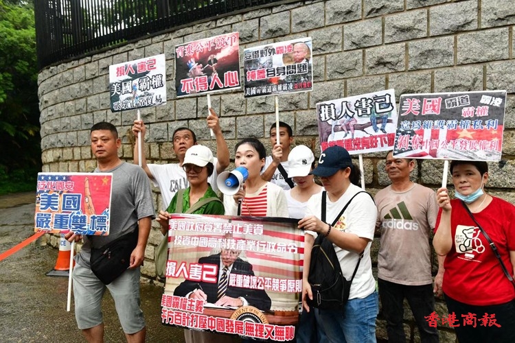 一眾市民高叫「美國霸權破壞正常貿易,損人害己,背棄公平原則,不得人心。美國泛化國安,嚴重雙標,脫鈎斷鏈,沒有好下場。」等口號,有代表其後手持標語紙牌,並把請願信置於總領事館門外。