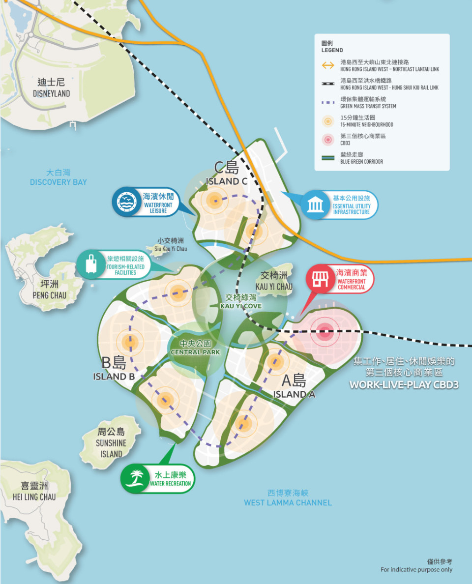 公眾意見中,提及填海範圍的約佔四成,提及概況土地用途的約佔五成,而提及策略性運輸基建及可能融資選項的分別約佔三成。大部分意見支持擬議的「三島設計」並以「Y形」水道分隔各人工島。普遍支持的原因包括擬議的「三島設計」已充分考慮水質及生態等因素,並可保育附近的自然島嶼。同時,他們對「Y 形」水道設計能夠緩解城市熱島效應表示認同,亦認為可為人工島將來居民創造大量的海濱區域。