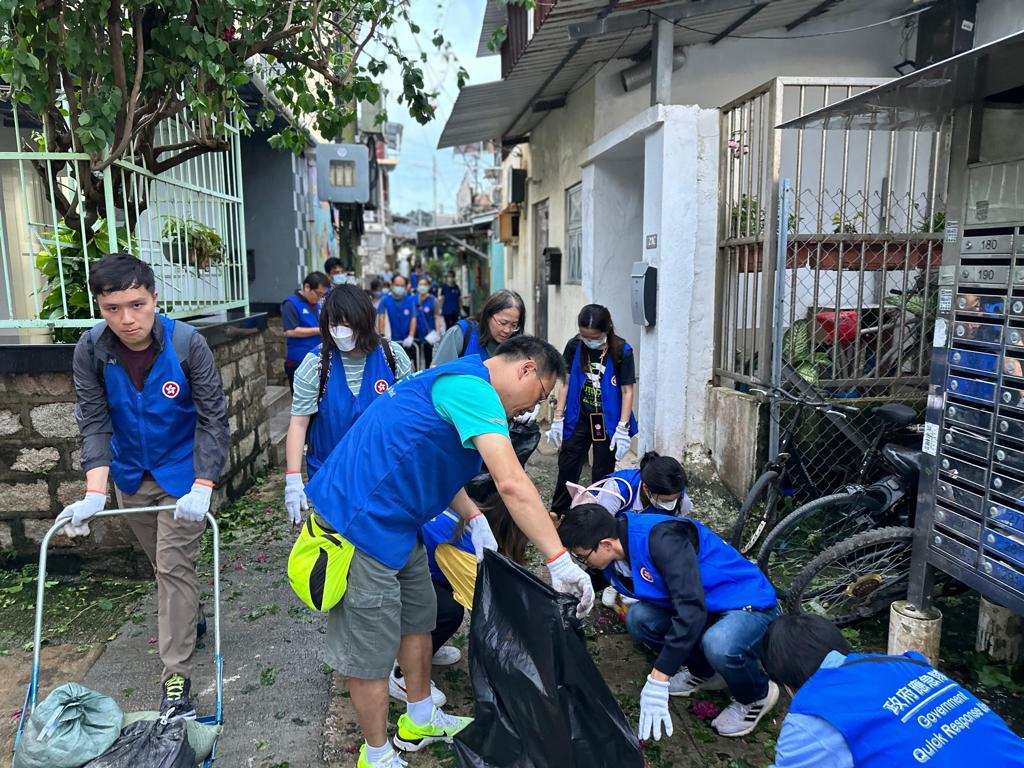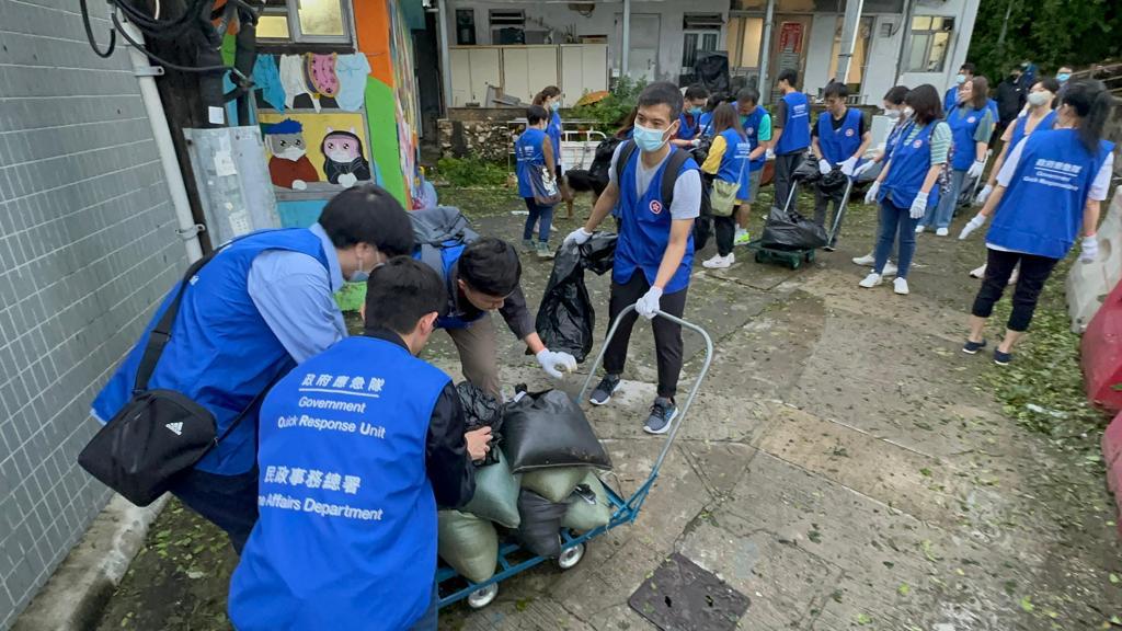 公務員事務局局长楊何蓓茵晚上在社交平台發文,指在行政長官批准啟動「全政府動員」級別後,局方即時按動員機制,動員約百名來自不同部門的人員組成隊伍到多區提供支援,包括到沙頭角協助早前在臨時庇護處所暫住的長者返回護老院舍;到東涌鄉一帶進行清理工作,移除路面上的垃圾和被強風吹倒的樹枝和落葉;以及到觀塘協助居民移除沙包,並清理鯉魚門海傍道行人路和用作臨時庇護中心的鯉魚門體育館。