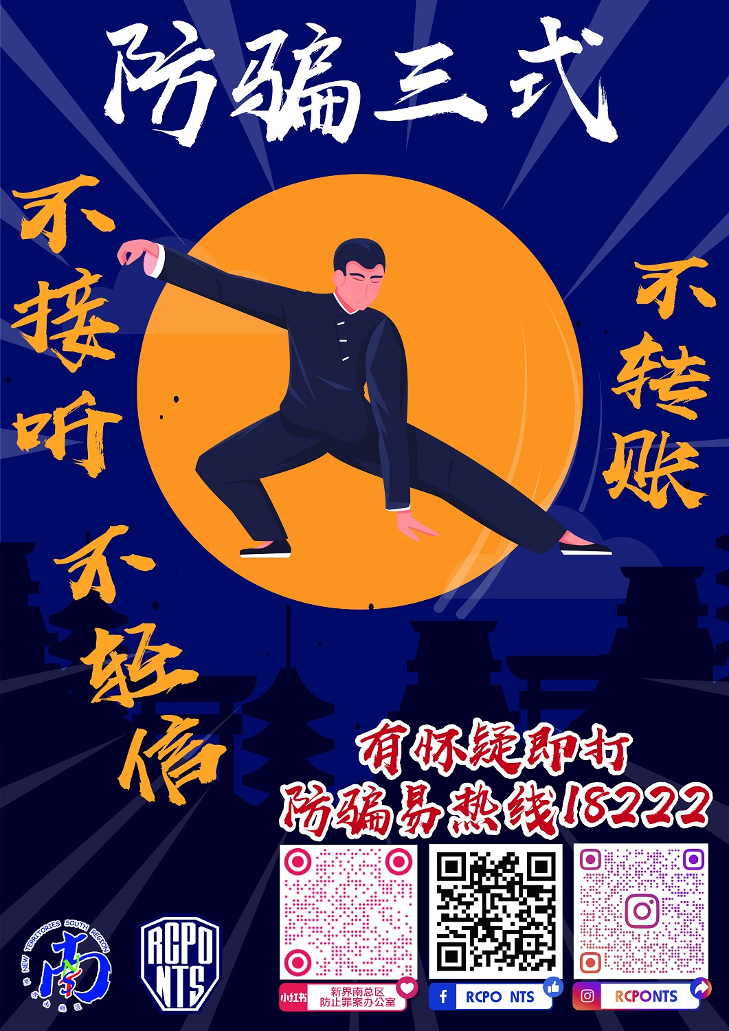新界南總區防止罪案辦公室主任陳詠君總督察表示,港漂初到香港未了解本港文化和法律時便有機會收到各類詐騙信息,容易誤墮騙局,呼籲各界當港漂或其他市民大眾遇到懷疑騙案時,謹記「防騙三式」,即「三不」及「三求」。「三不」包括「不接聽」、「不輕信」及「不轉賬」;「三求」則是「求助」、「求教」和「求救」。遇到不明來電時尋找身邊親友分析事件;求教長輩的建議、打999找警方求救,及致電警方24小時防騙易熱線18222。