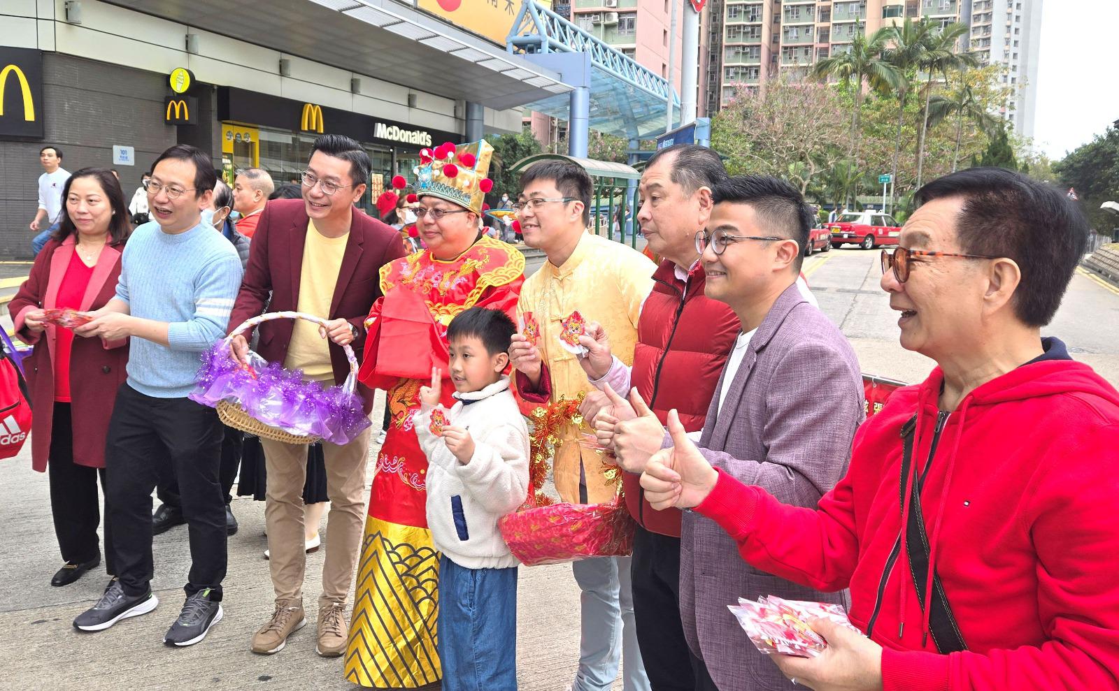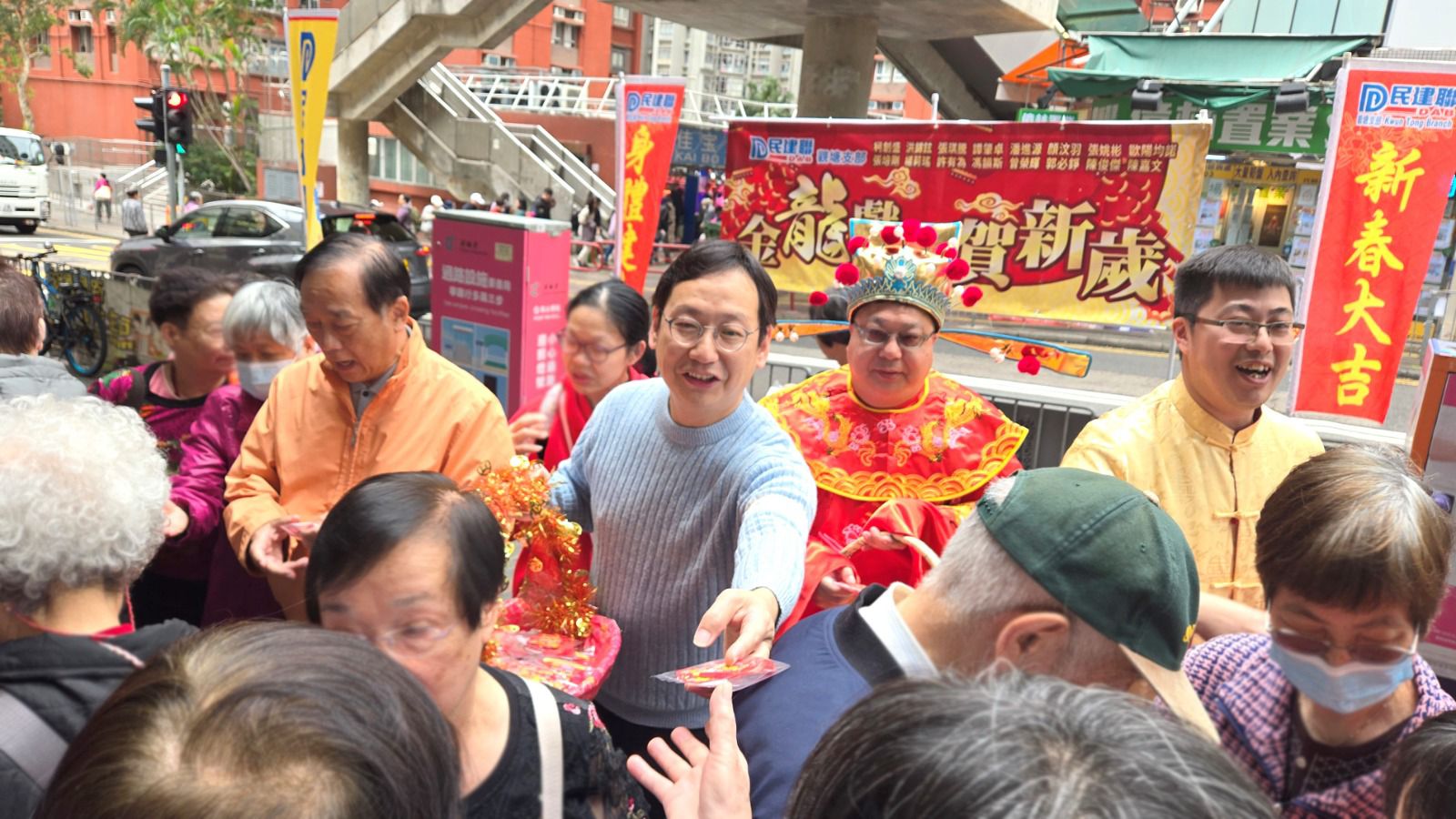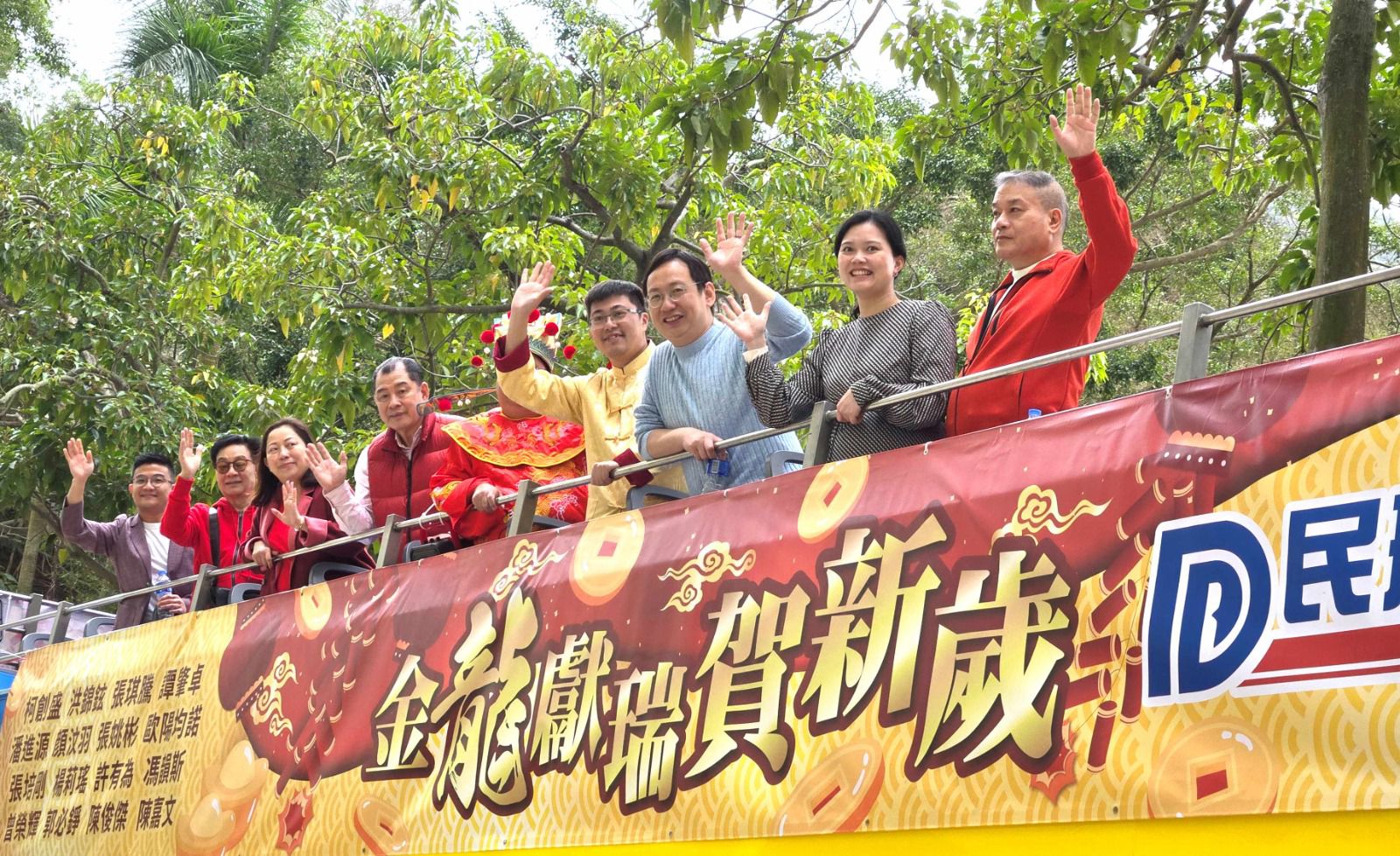 為迎接甲辰龍年,民建聯觀塘支部今日(19日) 舉行「金龍獻瑞賀新歲」花車巡遊,在「財神」陪同下民建聯多名議員及支部委員以花車代步,巡遊觀塘各區向市民拜年,並途經5個站點,包括藍田啟田商場、油塘高翔苑、秀茂坪商場、樂華邨巴士站以及觀塘港鐵站A出口,沿途巿民興奮地迎接「財神」派發的「利是」,希望迎接好運,祈望新一年行運一條龍;民建聯仝人亦祝願香港經濟蓬勃發展、百業興旺。