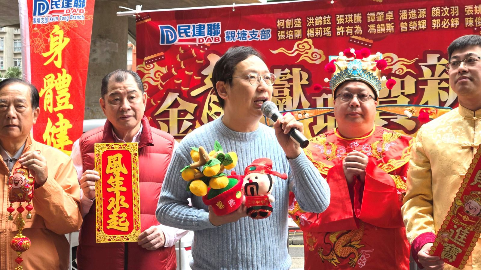 花車巡遊啟動儀式於藍田啟田商場對出舉行,民建聯觀塘支部主席柯創盛議員祝賀各位新一年龍年大吉、龍精虎猛。柯議員表示希望透過今年的花車巡遊以及各個新春賀歲街站,主動與市民接觸,增加與市民互動。相信市民最關注的是月底財政預算案的利民紓困措施,過往民建聯團隊亦有約晤財政司司長反映市民的期望,今次花車巡遊的目的,是希望向特區政府反映在開源節流的同時,亦要特別關注基層市民的需要及期望;而民建聯觀塘團隊,亦定必謹守崗位,以服務市民為己任。