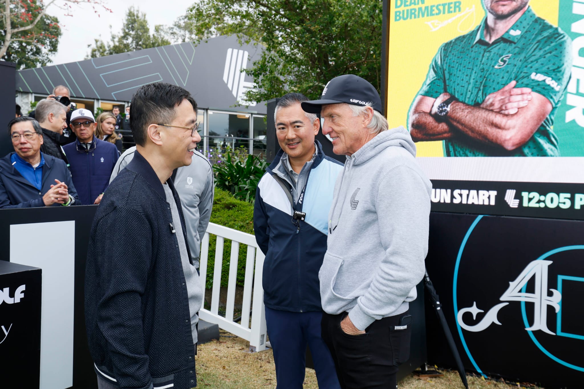 行政總裁格諾曼及香港哥爾夫球會會長郭永亮向文化體育及旅遊局局長楊潤雄介紹LIV Golf 。